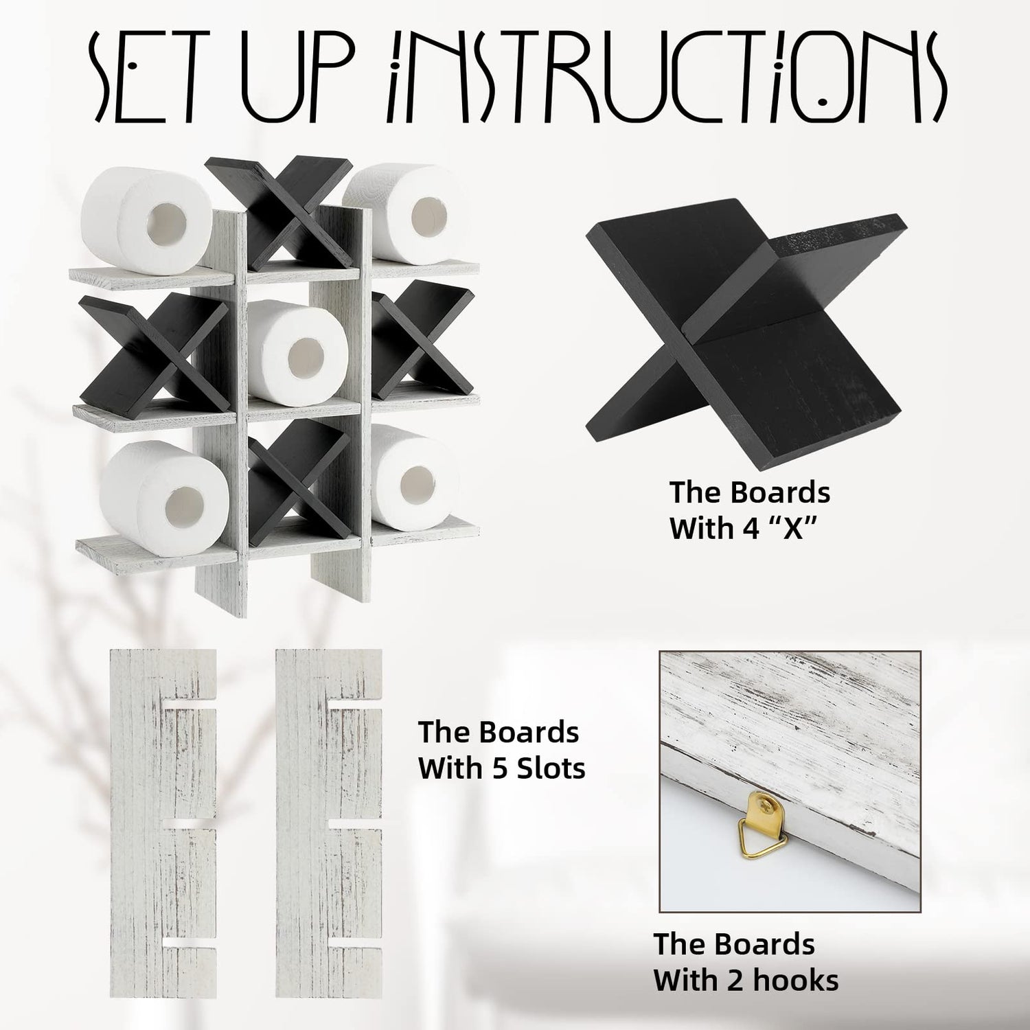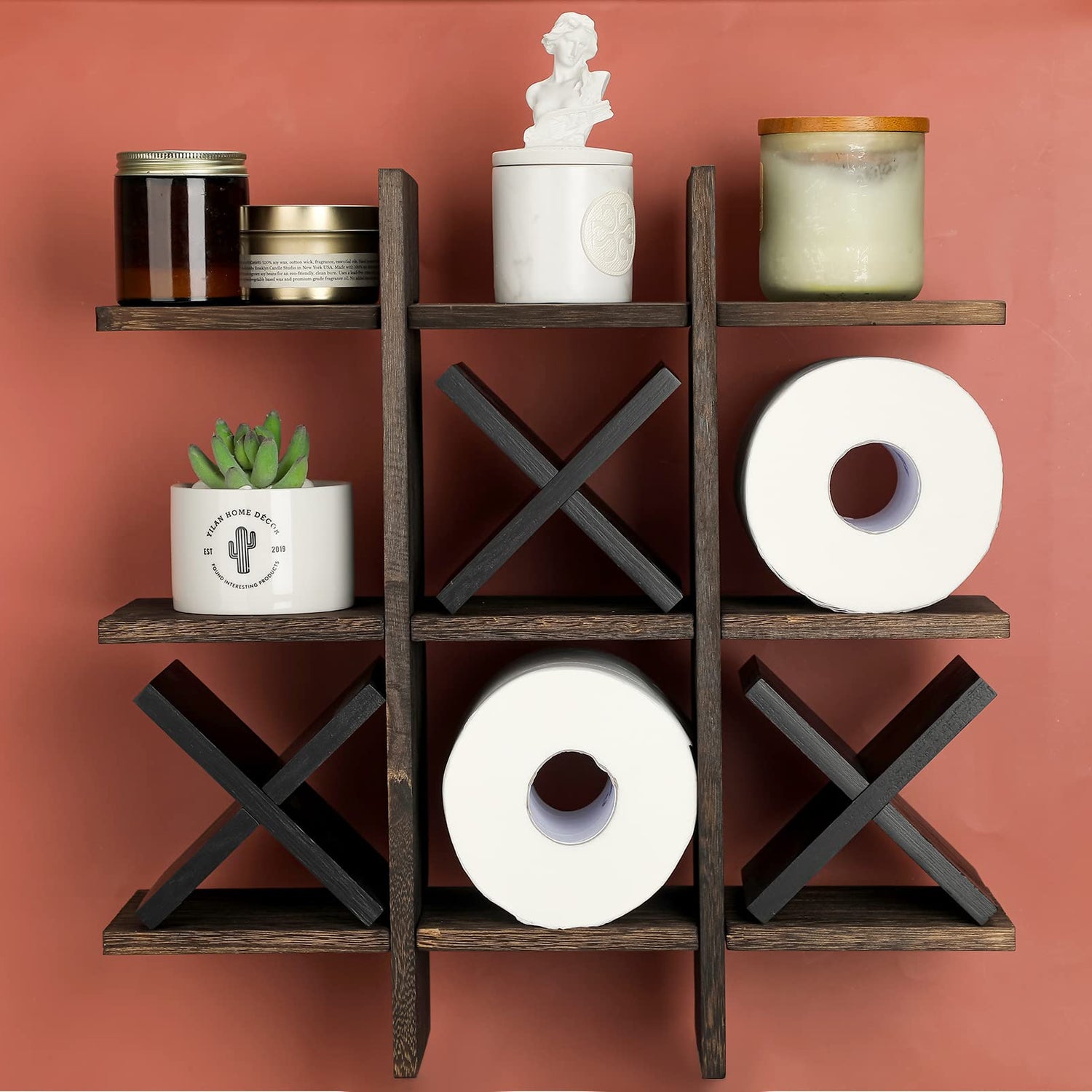 Weysat Tic Tac Toe Toilet Paper Holder Stand Bathroom Wall Decor Rustic Wooden Hanging Storage Freestanding Wall Mounted Shelves Decor for Toilet Tissue Farmhouse