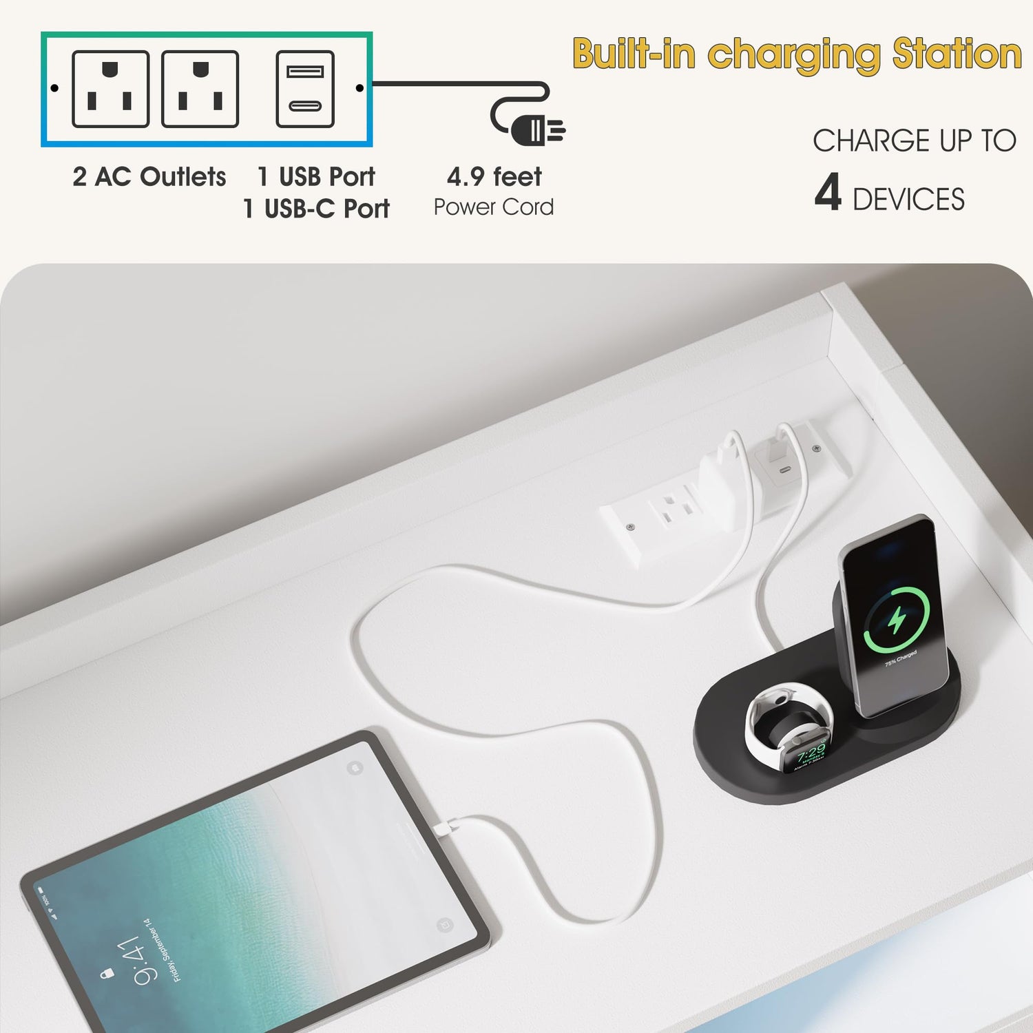 Whalefall 4-Drawer Tall Dresser with Charging Station & LED Lights - Modern Wood Chest of Drawers for Bedroom, Living Room, Hallway, or Entryway, Sturdy Storage Furniture (White)