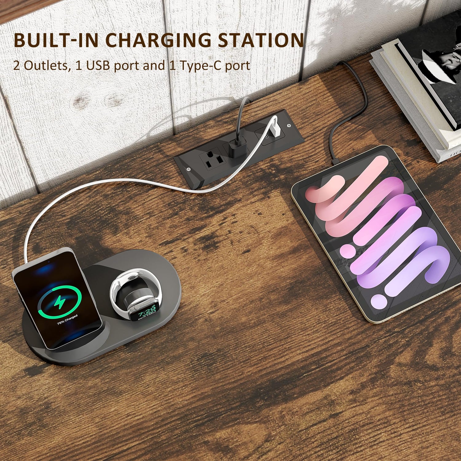 - Integrated Charging Station: This writing desk is equipped with a built-in power strip featuring two standard outlets, a USB port, and a Type-C port, providing convenient access to power for your phone, laptop, and other devices