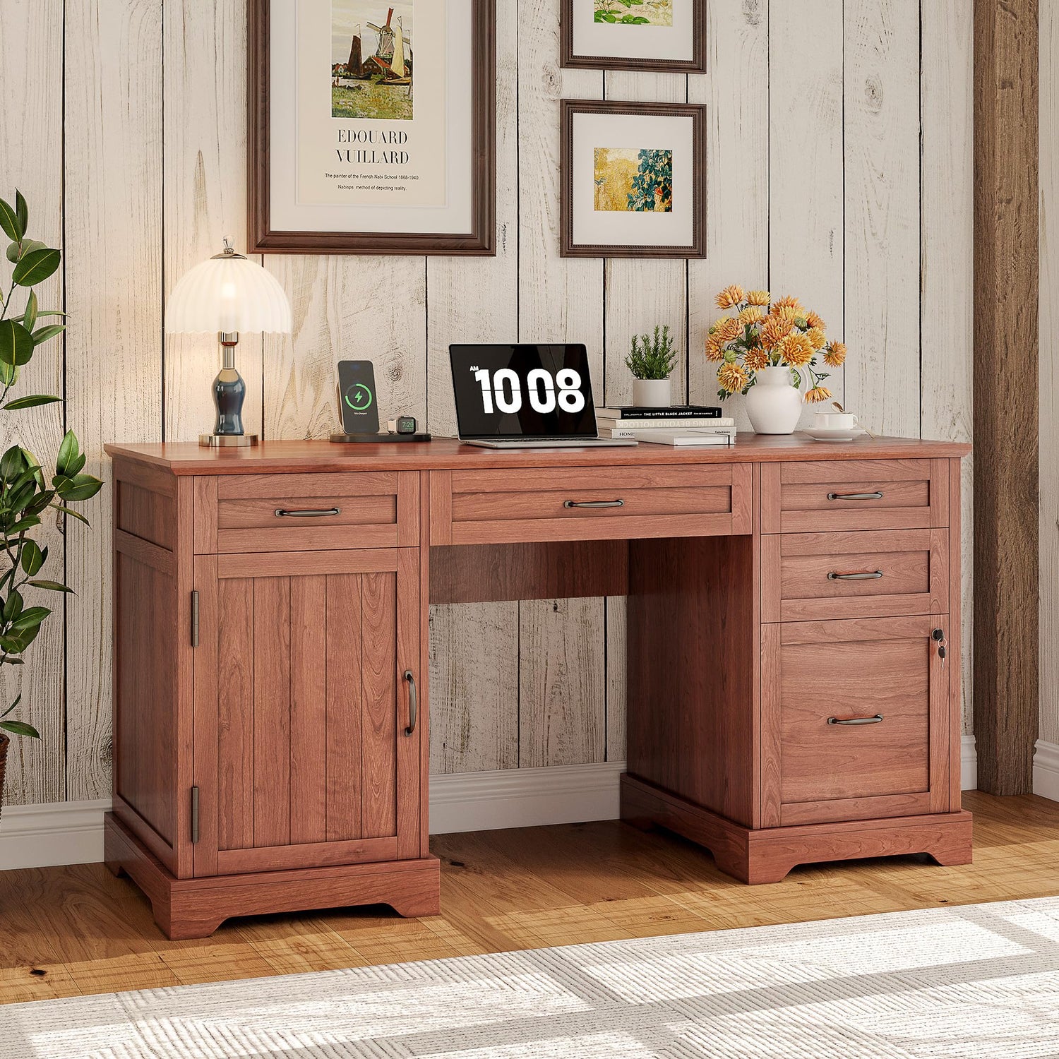 Whalefall Executive Desk with Drawers, 55'' Farmhouse Desk Wooden, Home Office Computer Desk with File Cabinet and Charging Station, Cherry Brown
