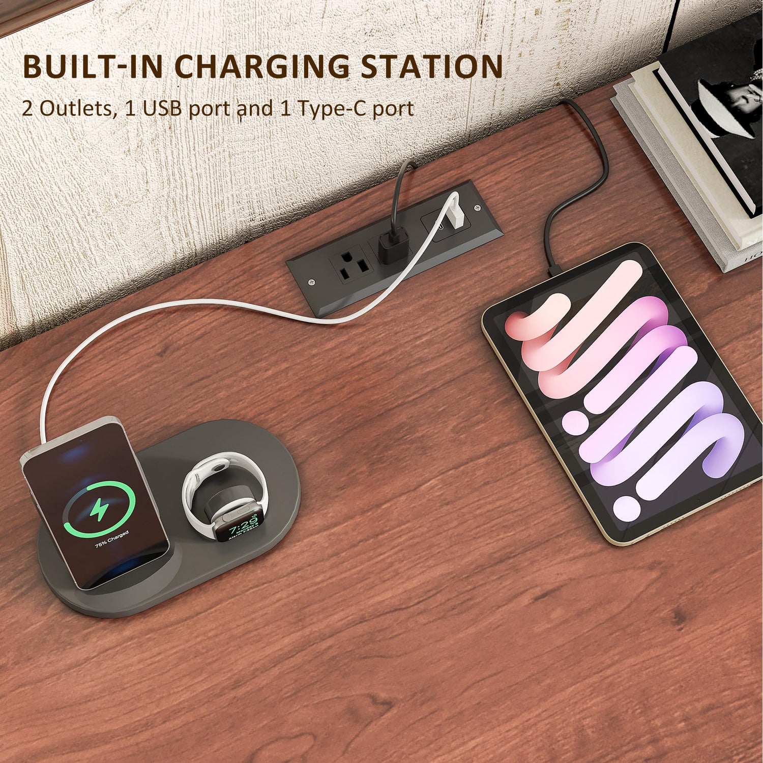 - Integrated Charging Station: This writing desk is equipped with a built-in power strip featuring two standard outlets, a USB port, and a Type-C port, providing convenient access to power for your phone, laptop, and other devices