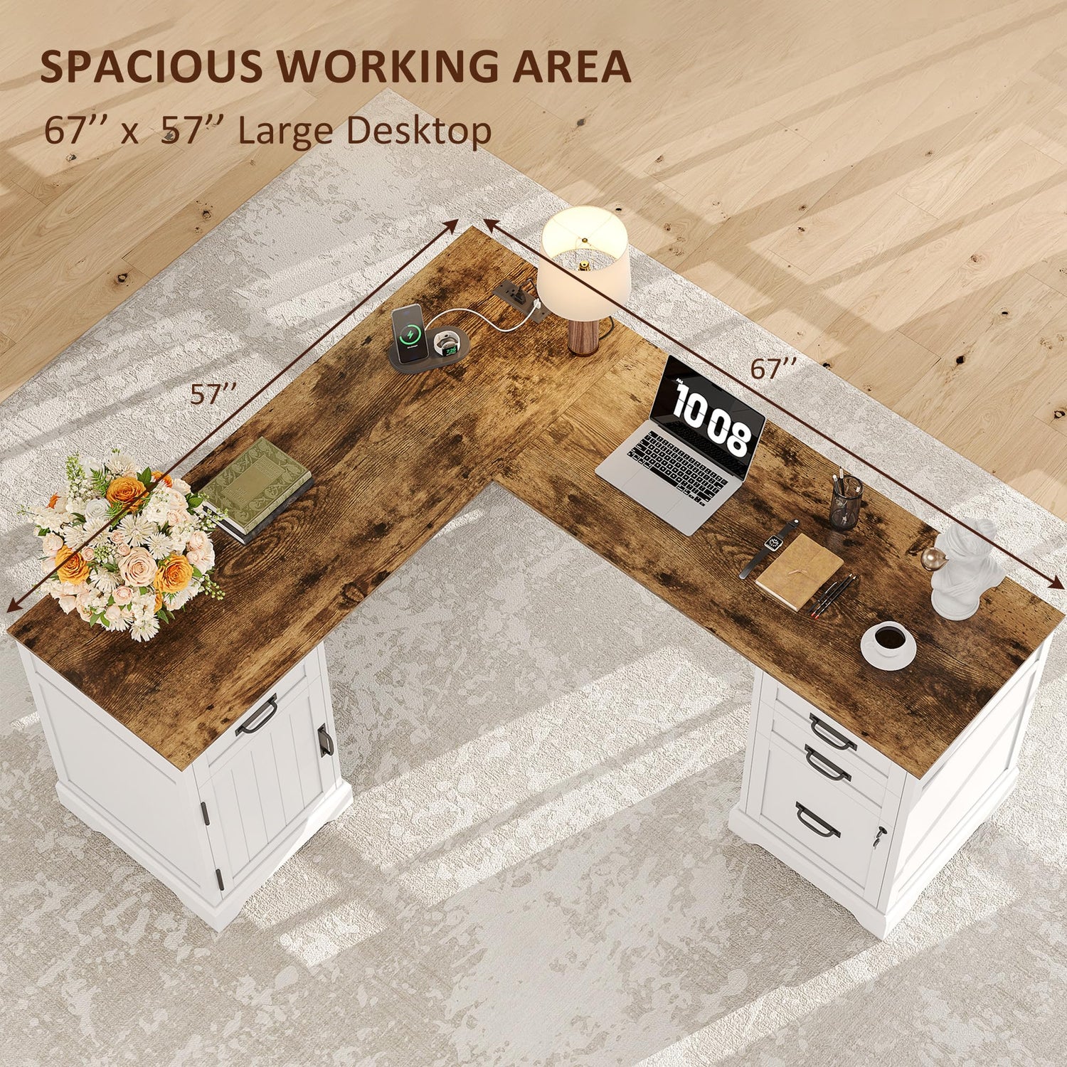 Whalefall Farmhouse L Shaped Desk with Drawers, 67 Inch Executive Home Office Desk with File Cabinet, Computer Corner Desk with Charging Station, White