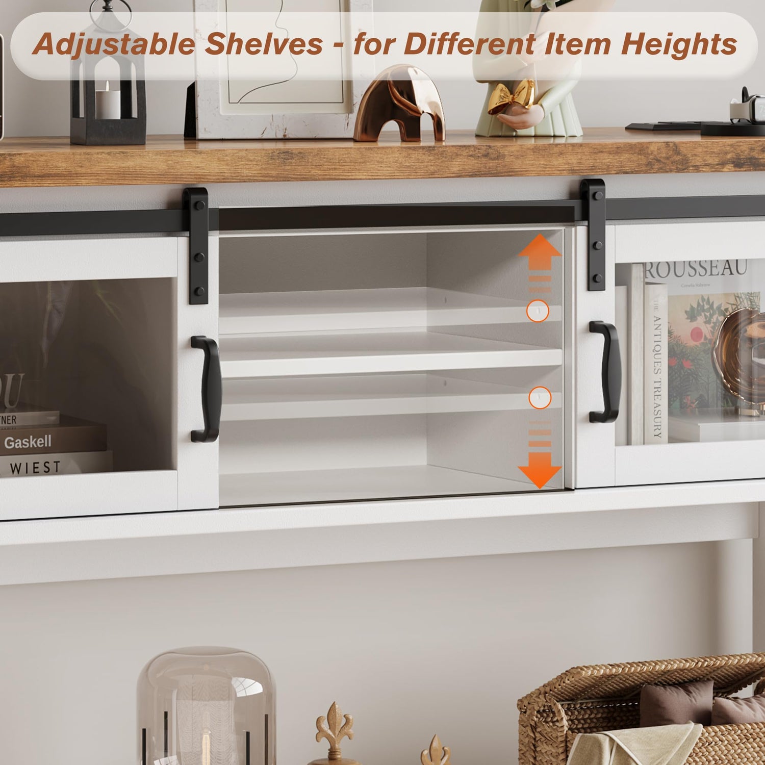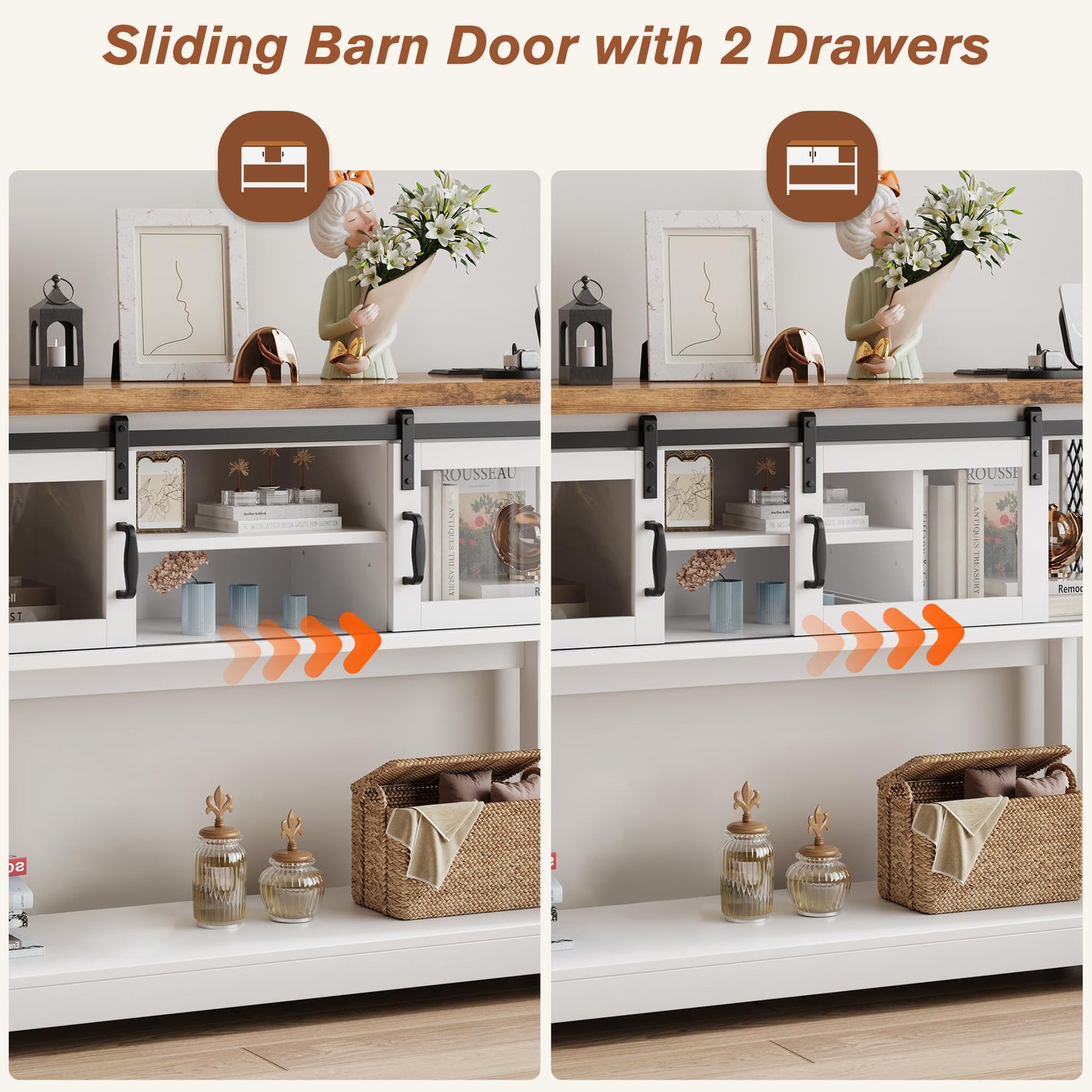 - 【Ample Storage Space】Spacious tabletop with 46'' W *14'' D. This Farmhouse style console table is equipped with 5 storage space in total, adjustable shelf plus 2 led visual cabinet and bottom shelf. Allows to categorize your items, which can store your clothes, blankets, books, or any other personal items. 2 Visual display drawers can be used to place photo frames, decorations etc.