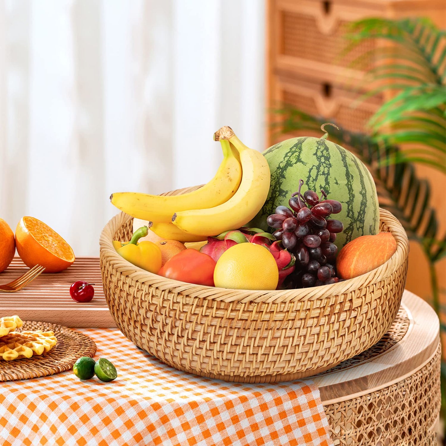 Whalehub Natural Rattan Round Fruit Basket Bowls, Hand Woven Decor Serving Baskets, Wicker Storage for Dinning Room (Round-Small)