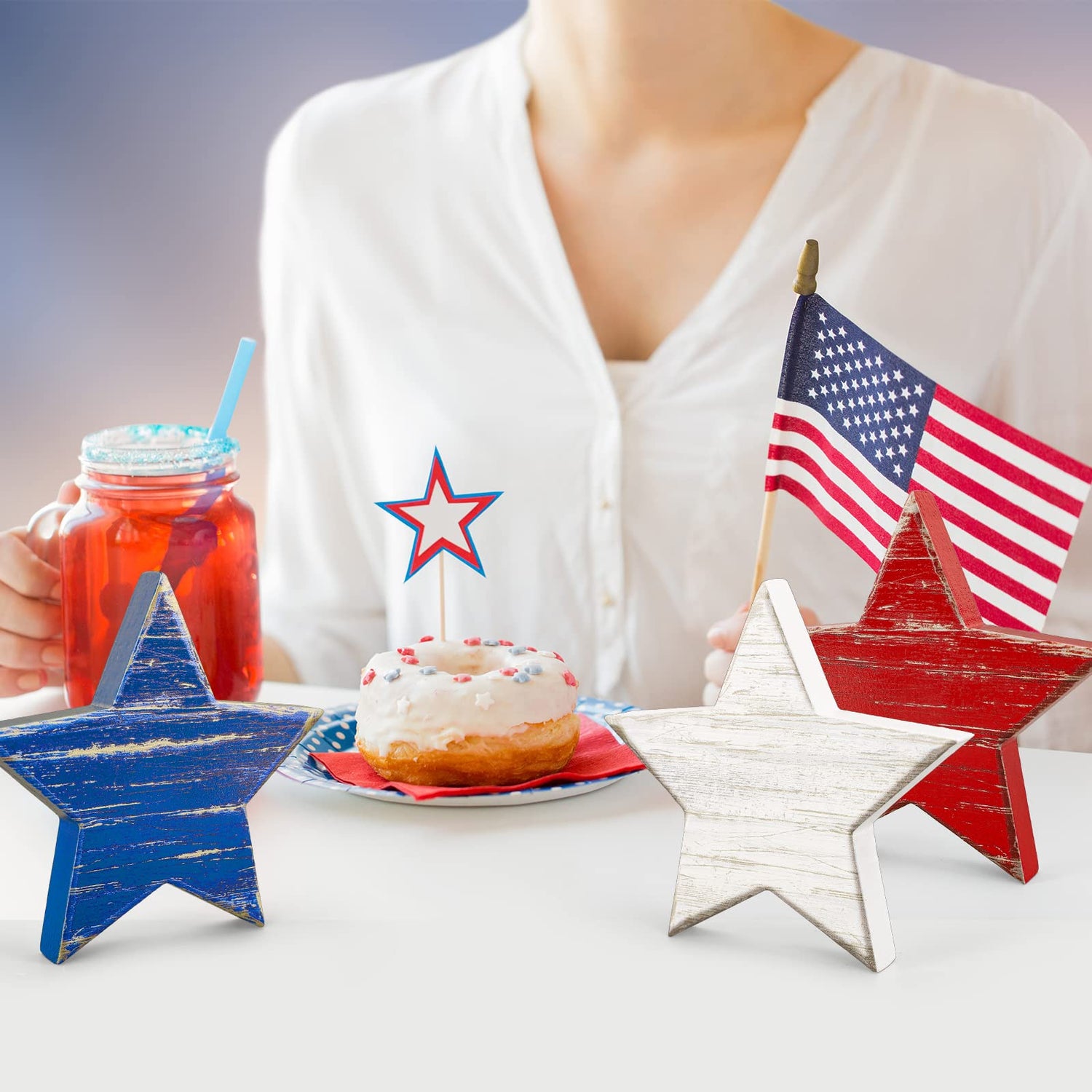 Whaline 4th of July Wooden Star Signs Patriotic Rustic Star Shape Tiered Tray Decor Red Blue White Wood Star Blocks Retro Freestanding Table Signs for Independence Day Farmhouse Home Decor, 3Pcs