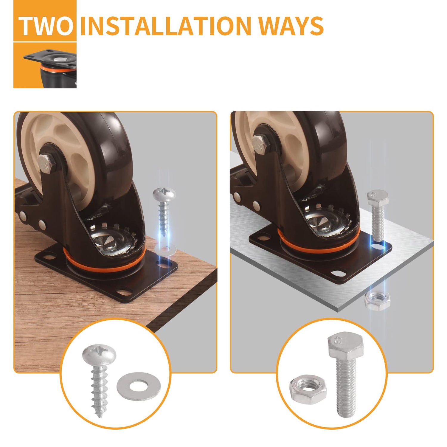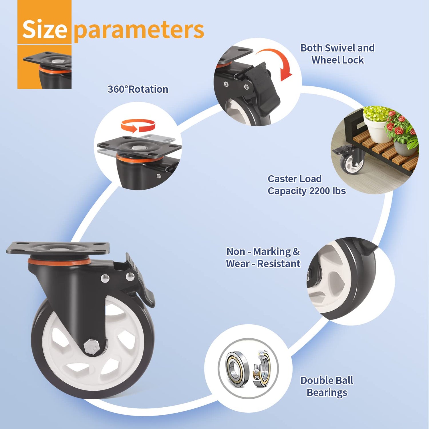 - 【DOUBLE SAFETY BRAKE, SAFETY AS YOU NEED】 These swivel locking casters are designed with safety dual locking system, each wheels for cart could effective to brake the rotation direction of the bottom plate and the direction of the wheel forward. This combination wheel brake and swivel lock is essential to stop and prevent the devices from moving and hurting others, holding the equipment firmly in place.