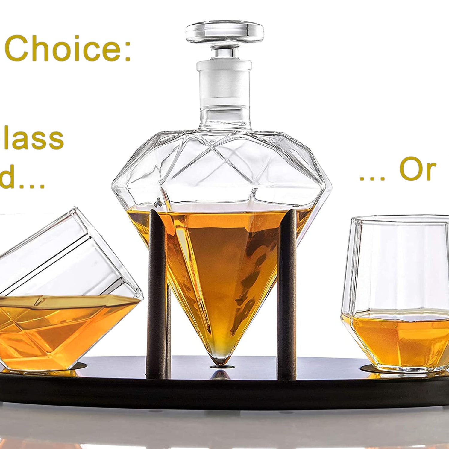 - HANDCRAFTED ELEGANCE: Handmade and hand-blown by skilled craftsmen, this diamond shape whiskey decanter is designed to provide you with an elegant and stylish way to impress all your guests and leave a lasting impression. This glass decanter set is a must-have for the whiskey connoisseurs and bar owners that want to add more class to their home, bar, or office.