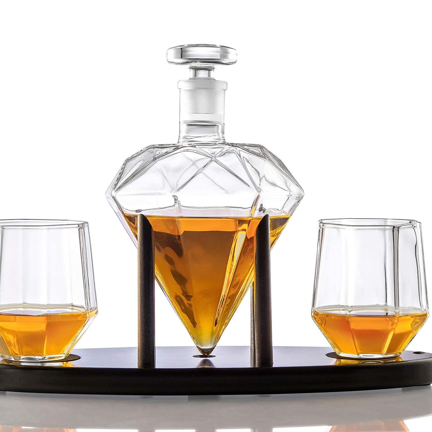 - THE FULL BAR SET: This Diamond Whiskey Decanter with glass decanter stopper is simply a must have for anyone that wants to make their drinks more enjoyable. It comes with 2 high-quality diamond shaped glasses and a beautiful Mahogany wood holder to make sure you have everything you need to enjoy drinking by yourself or to entertain guests.