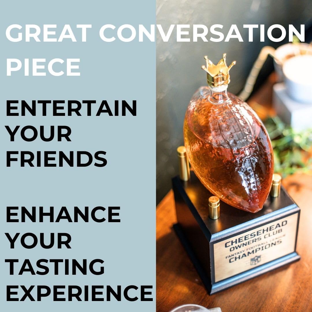 - 🤩Unforgettable Presentation: This whiskey decanter trophy is designed to award, entertain and impress. It is truly a unique and distinguished award, fit for a champion. The matte black base is made of heavy pressed wood with sturdy gold metal posts to support the whiskey decanter. The crystal glass decanter is meticulously crafted in the perfect shape and texture of a football topped with a stunning gold metal crown airtight stopper to keep your spirits fresh and flavorful.