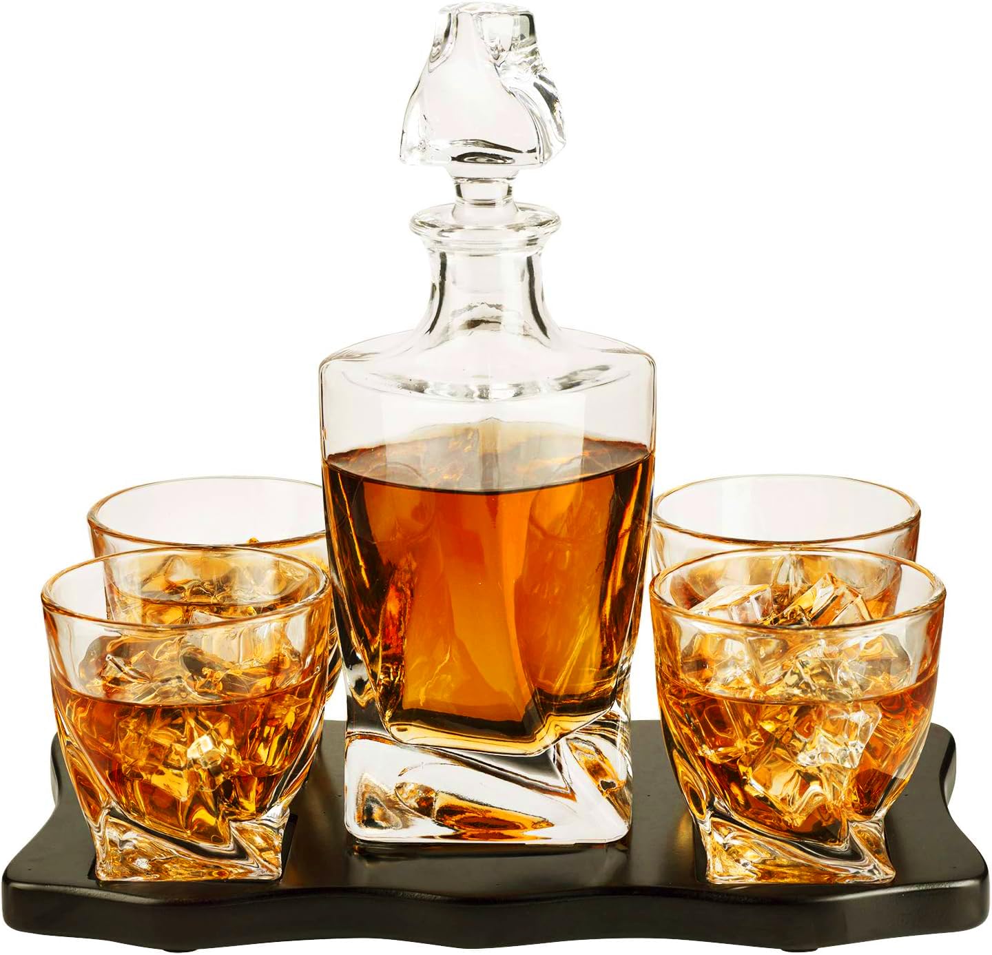 - BEAUTIFUL DECANTER SET ON WOOD HOLDING TRAY: This set of the hand carved Twisted Spiral Glacier Shaped Decanter and glasses, are part of The Wine Savant limited edition decanters and sets