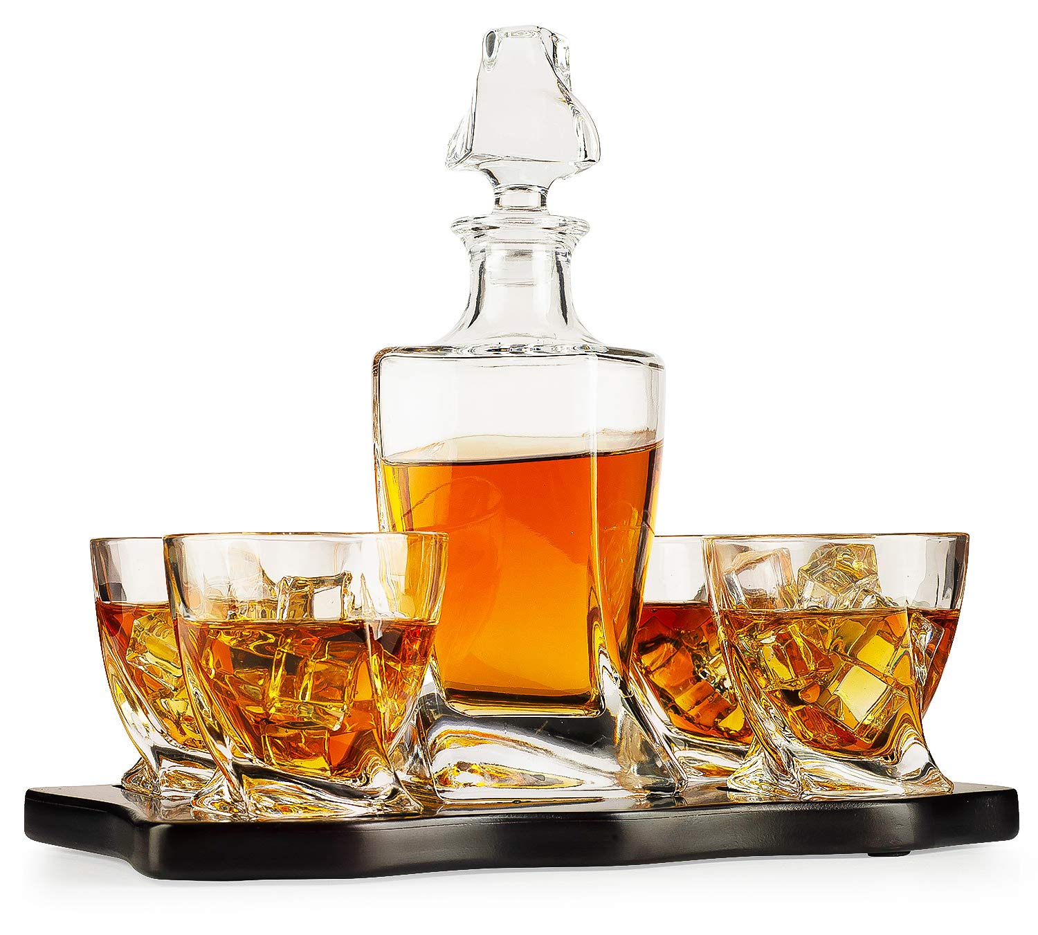 Whiskey Decanter & Glasses Crystal Set, Italian Crafted 5 Piece European Style Wine & Whiskey 855ml, With Wood Sophisticated Tray Set - Spirits, Scotch, & Bourbon Whiskey Glassware