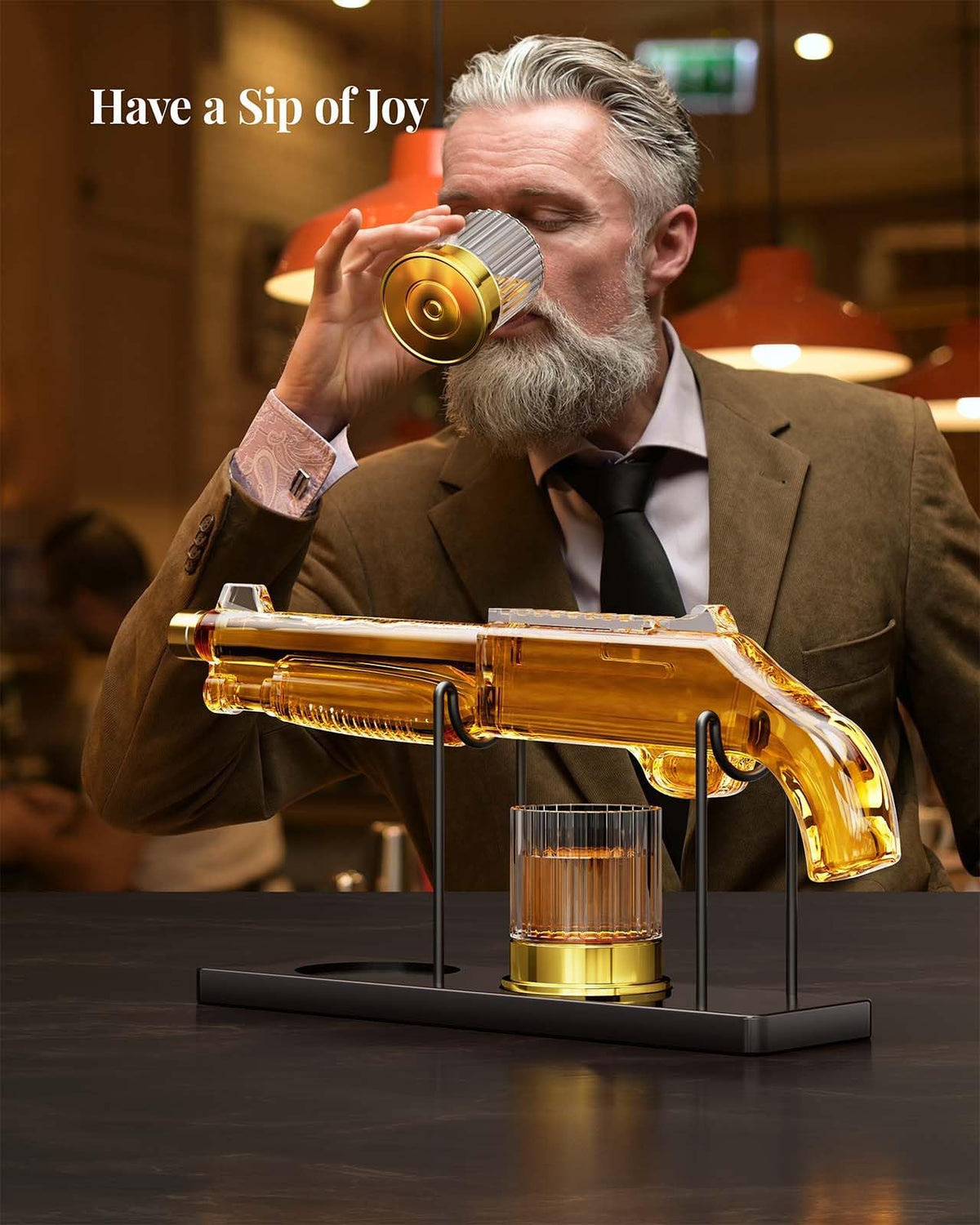 - Modern & Elegant Design: The uniquely shaped decanter, suspended for added style, brings a sophisticated feel to any setting. The two accompanying whiskey glasses with golden bases, resembling shot shells, reflect the spirit's golden color, enhancing the overall appeal. This design elevates every tasting experience and sparks engaging conversations