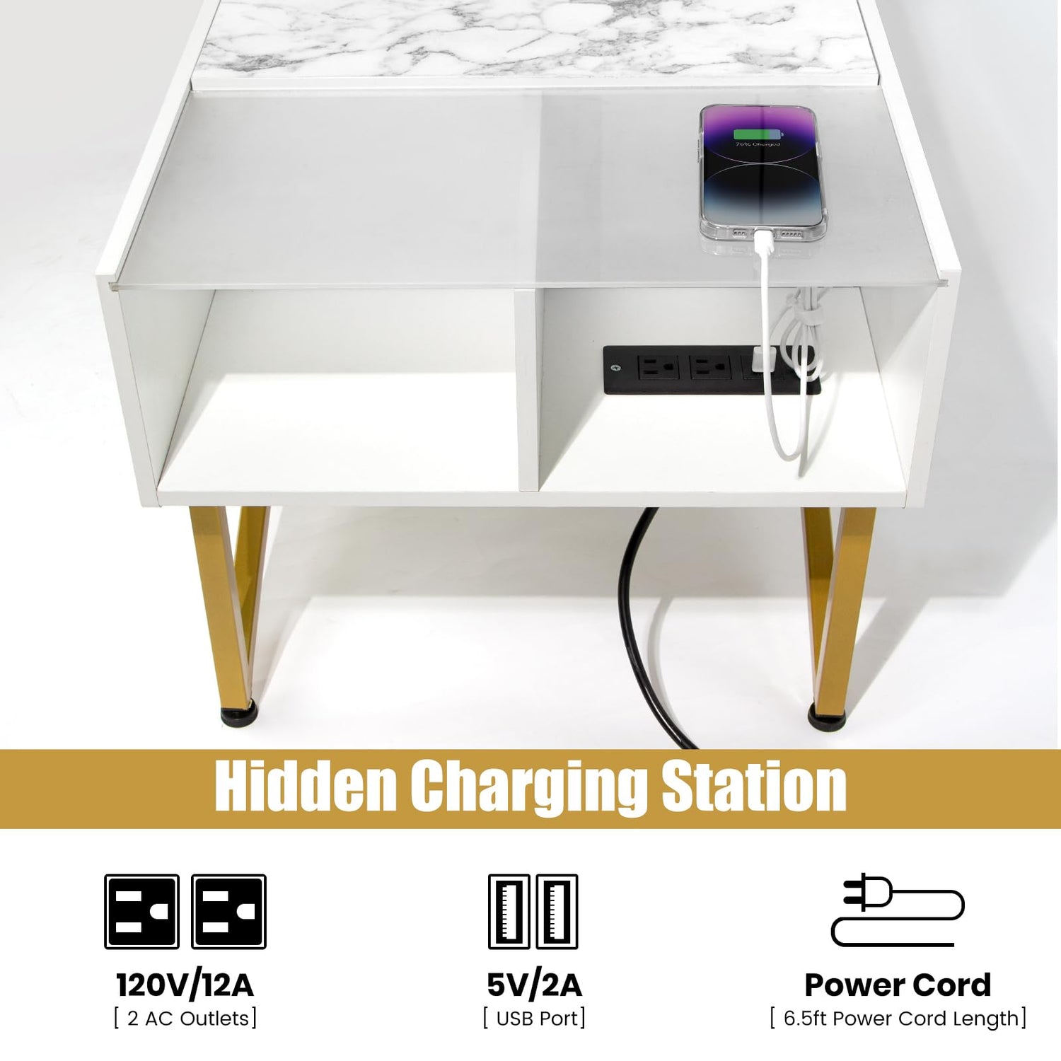 White and Gold Lift Top Coffee Table with Charging Station and LED Lights - 40" Lร—20" Wร—17" H Large Rectangle Marble Coffee Table Lift Top for Living Room, Glass & Marble-Pattern Tabletop, Metal Leg
