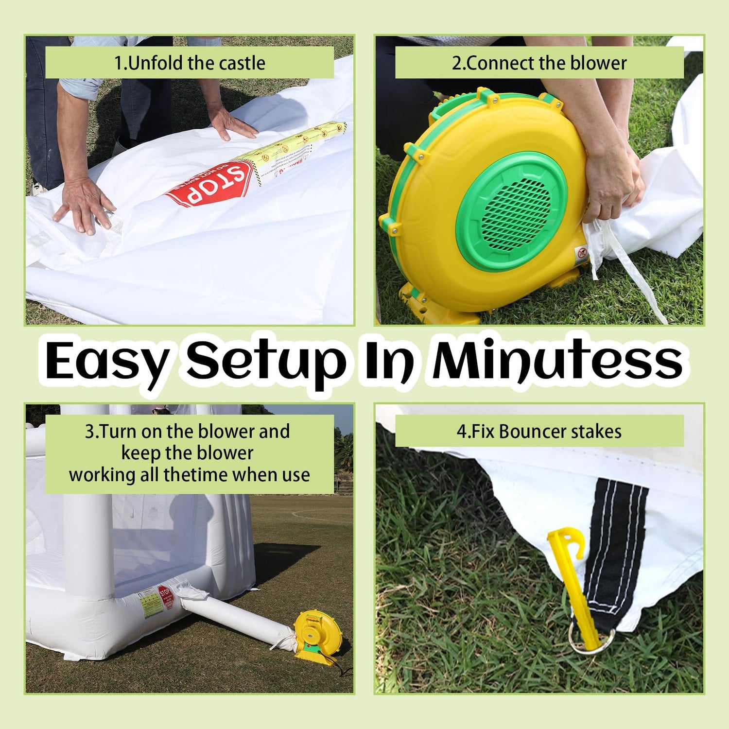 - Hassle-Free Setup: Setting up your inflantteble commercial bounce house for adults is a breeze with the 1100W blower—inflate and be ready in minutes! The large zipper vents make deflating and storing quick and easy