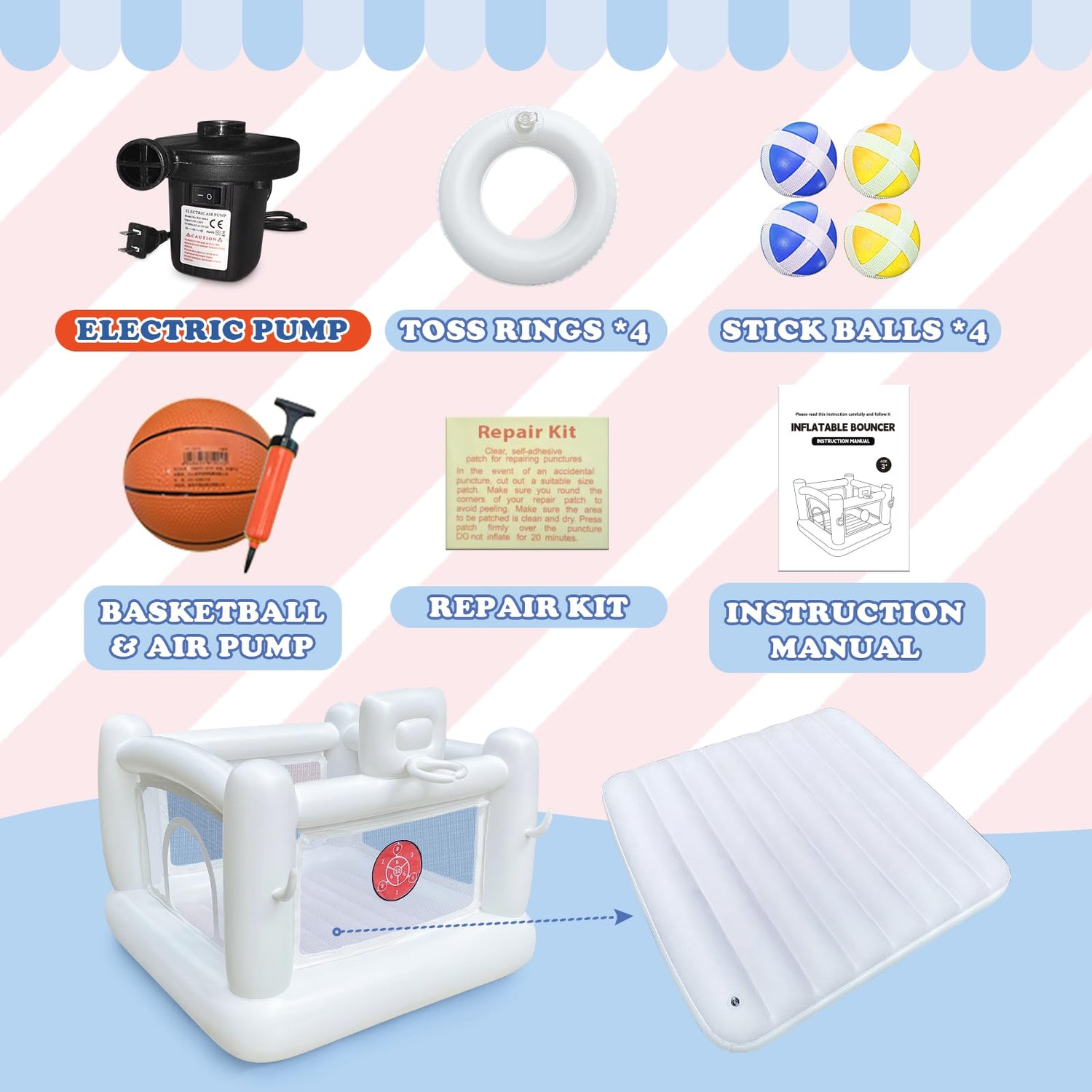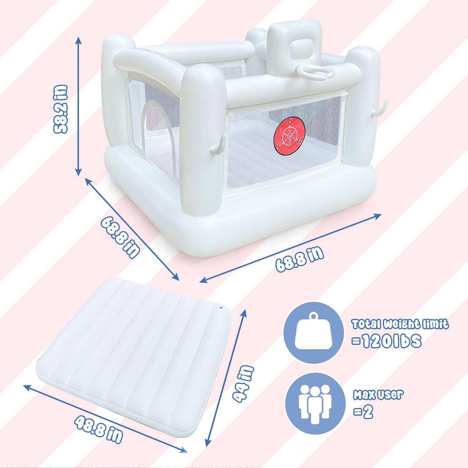 - White Bounce house for kids: Our inflatable castle and inflatable cushion are both detachable to meet the needs of various scenarios. The size of the bounce house is 58.2*68.8*68.8 inches. The size of the inflatable cushion in the center is 48.8*44*4 inches.Can accommodate up to two toddlers at the same time