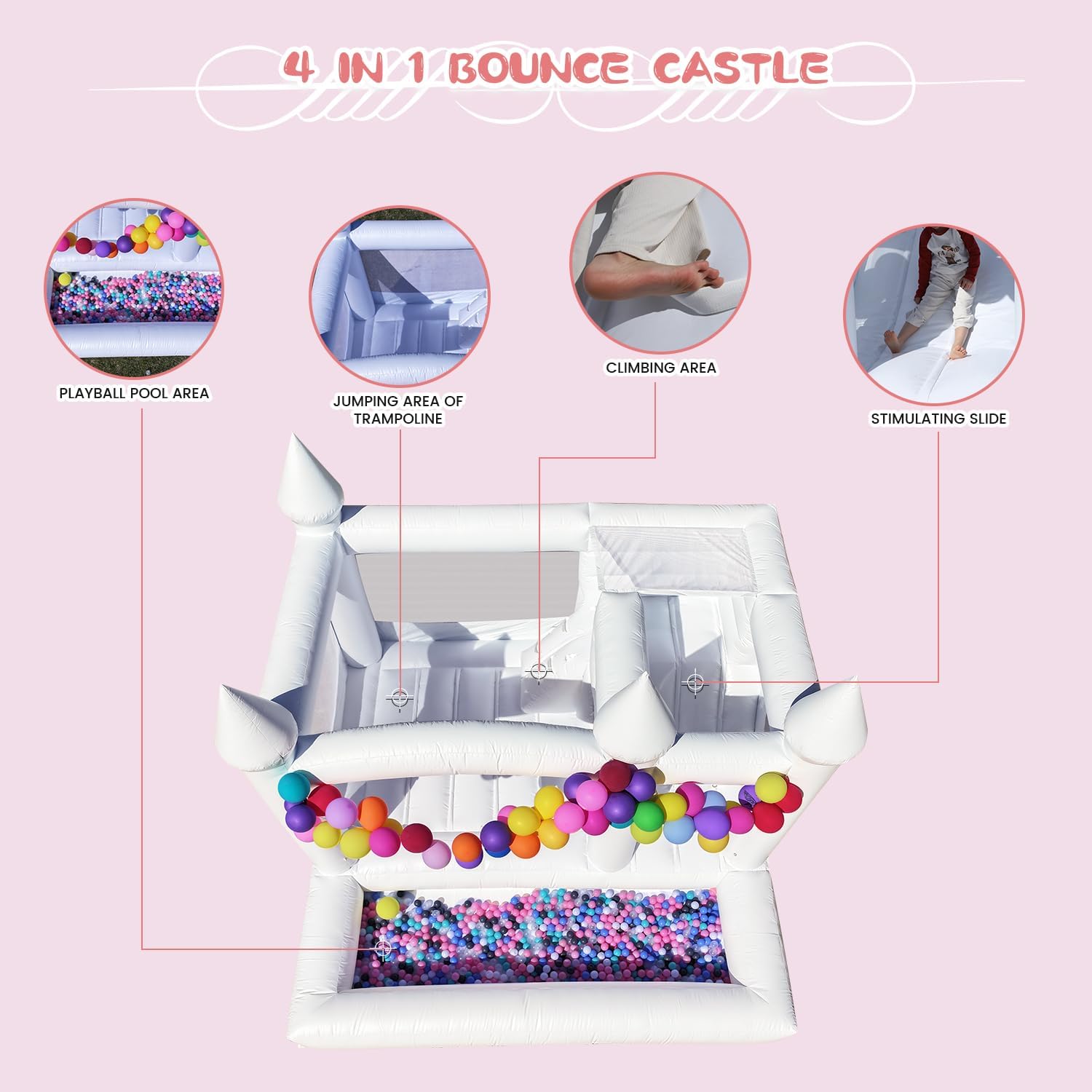 - ✿ COMMERCIAL GRADE: The White Bounce House with Slide and Ball Pit is made of strong quality 100% 0.3mm + 0.4mm reinforced 𝙋𝙑𝘾,whic is 5 times stronger than Oxford cloth and can be used multiple times,Every node is reinforced.perfect for rental companies or event planning, birthday party/photography or weddings.