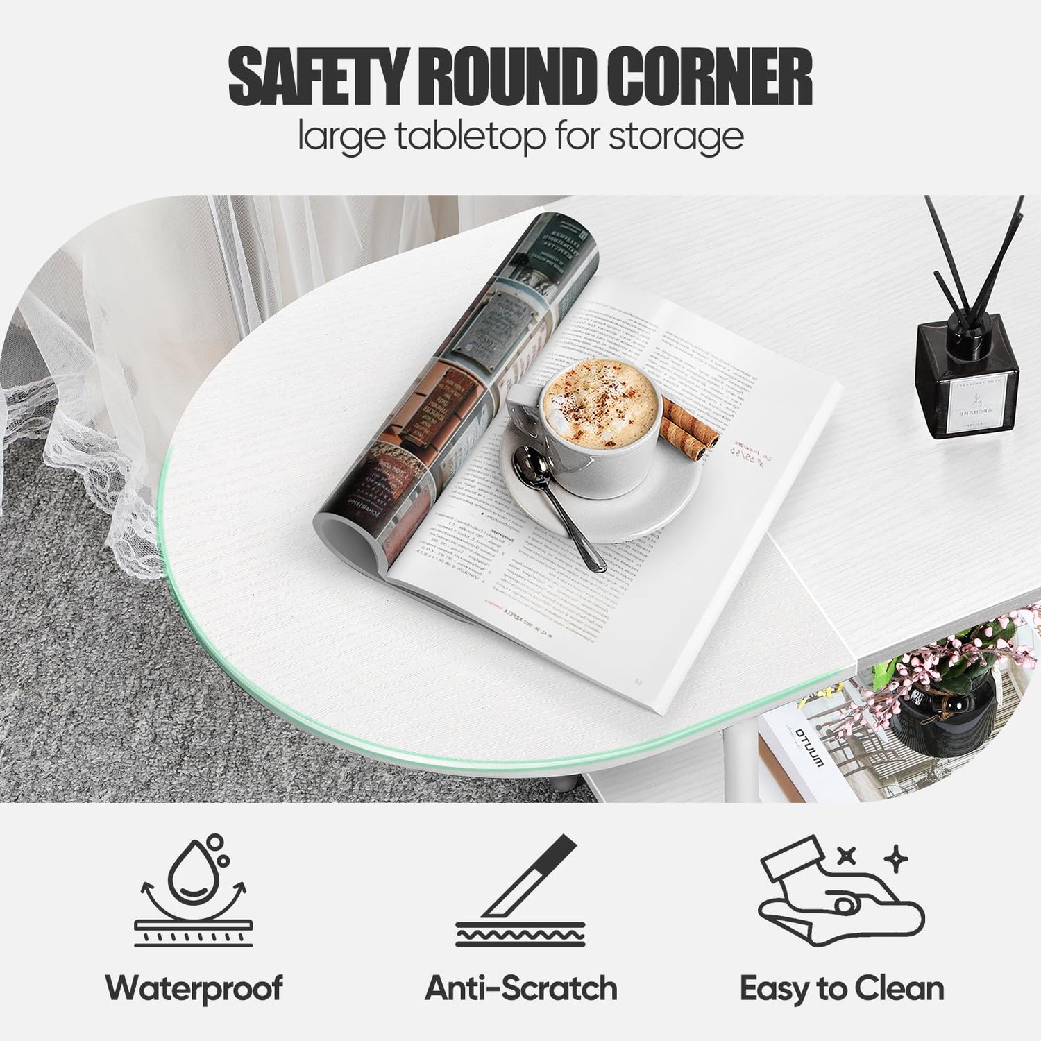 White Coffee Tables for Living Room,Mid Century Oval Center Table with Storage Shelf and Wood Tabletop,2-Tier Modern Narrow Cocktail Tea Table for Small Space,Small Apartment