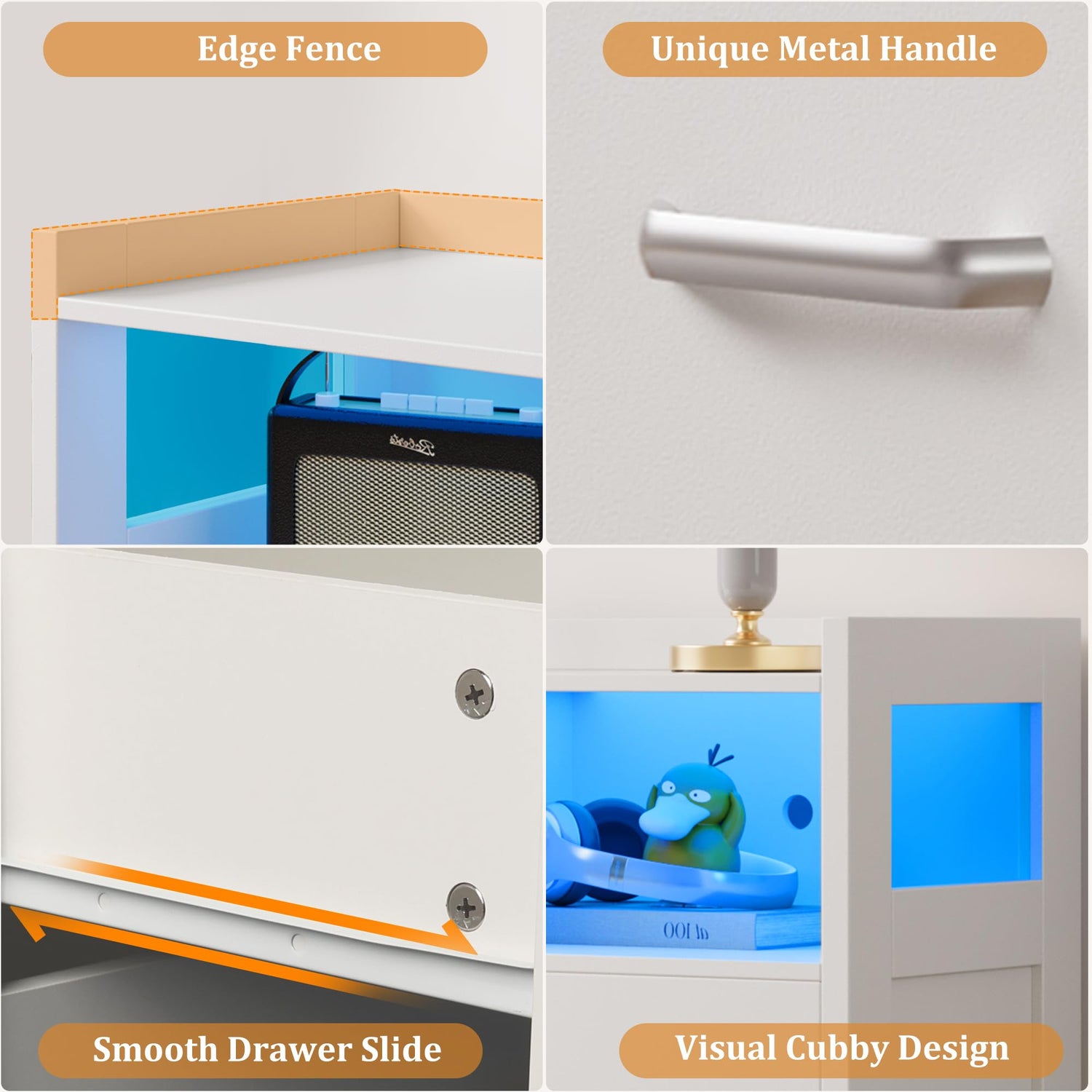 - Dresser with LED Lights: This wooden dresser includes an RGB LED light strip that can be turned on or off by remote or app; You can pick from multiple colors, adjust brightness, and customize modes like Flash, Jump, and Fade; Plus, it offers music mode, mic mode, and a timer; Perfect for adding a unique touch to your room