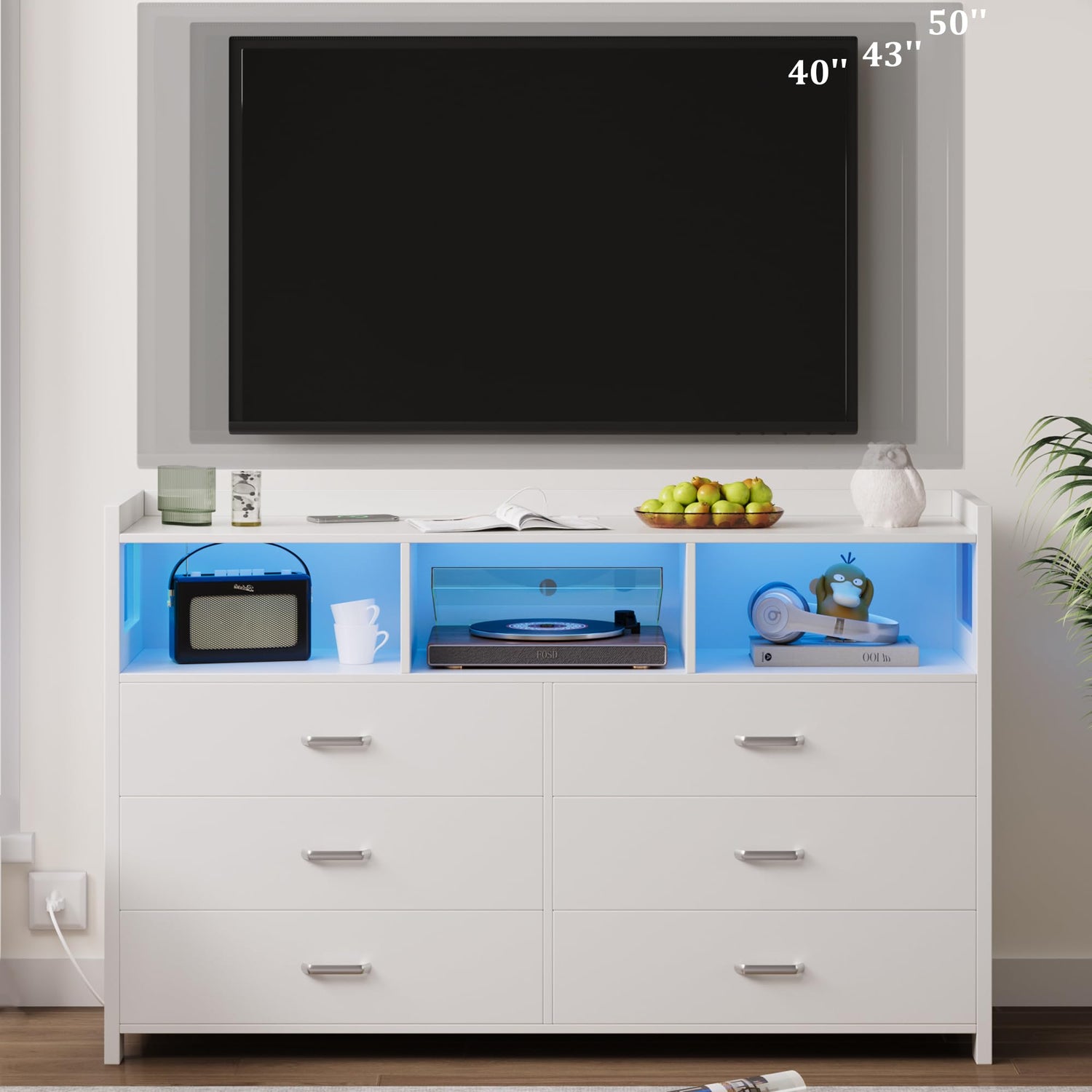 White Dresser for Bedroom with 6 Drawers, LED Dressers & Chests of Drawers with Power Strip, Modern Dressers Wide Storage for Bedroom Closet