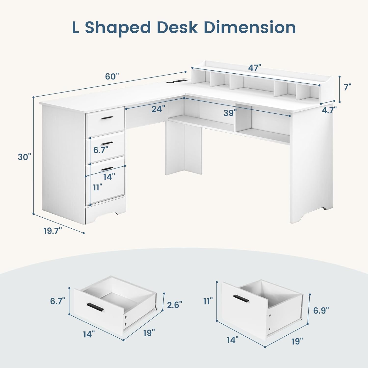 - 【Power Outlets and USB Charging Ports】:White L shaped desk with drawers features 2 USB ports, 2 power outlets. This corner desk with charging stations supports a range of devices including your computer, phone, gaming gear, and other electronic devices.