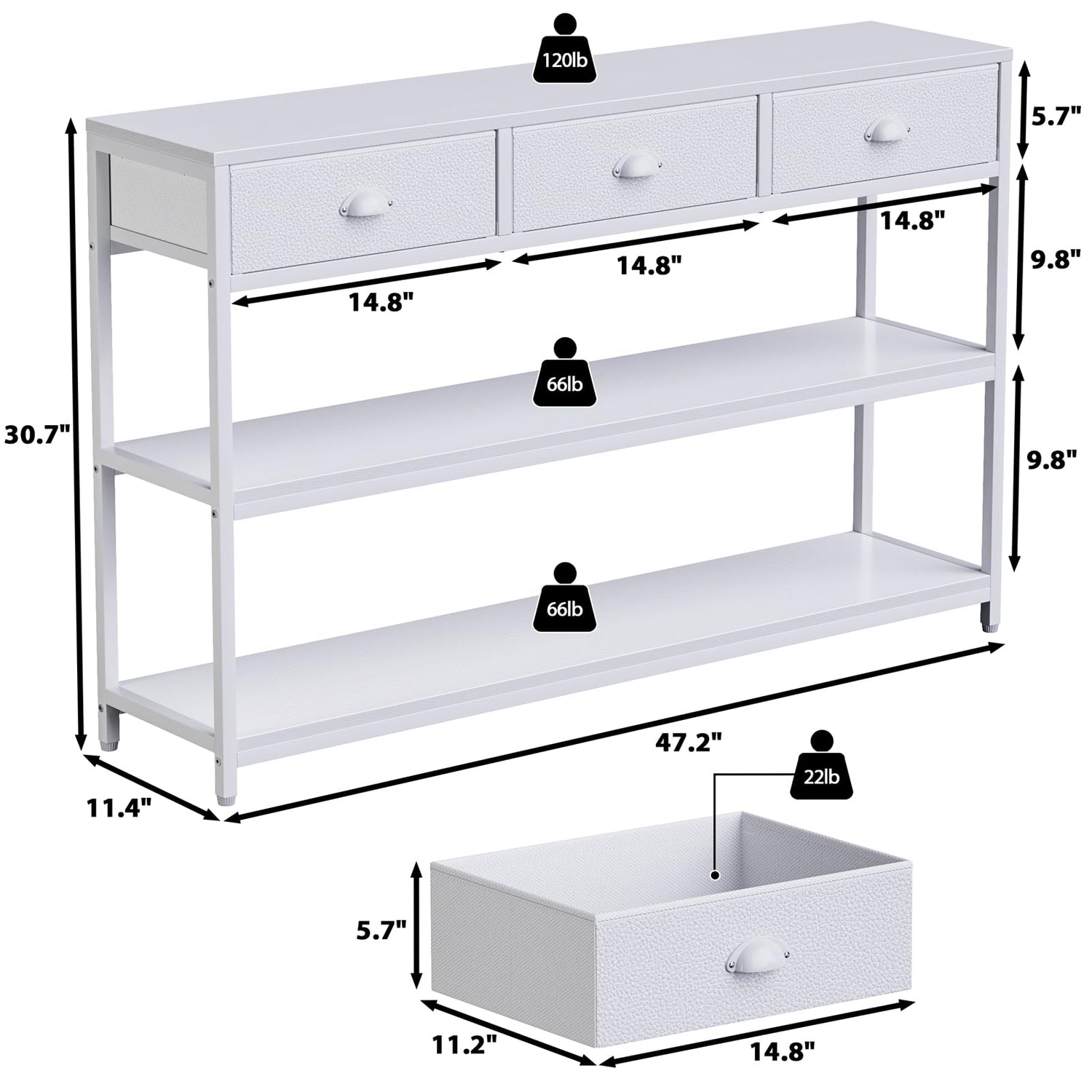 White 47" Console Sofa Table with 3 Drawers and Multi-Tier Storage Shelves for Entryway and Living Room