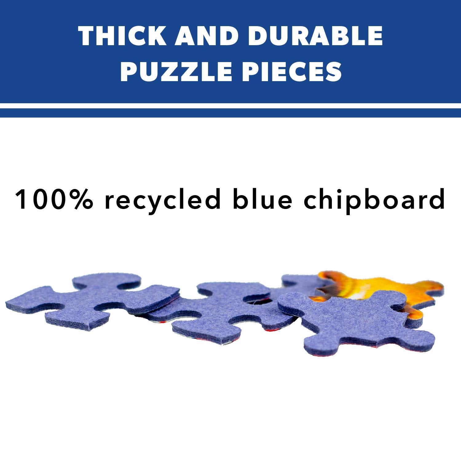- HIGH QUALITY DESIGN: This 1000 piece jigsaw puzzle contains thick interlocking pieces made from recycled premium blue chipboard that give a sturdy feel & easy grip. Made in USA. Finished size 24”x30”.