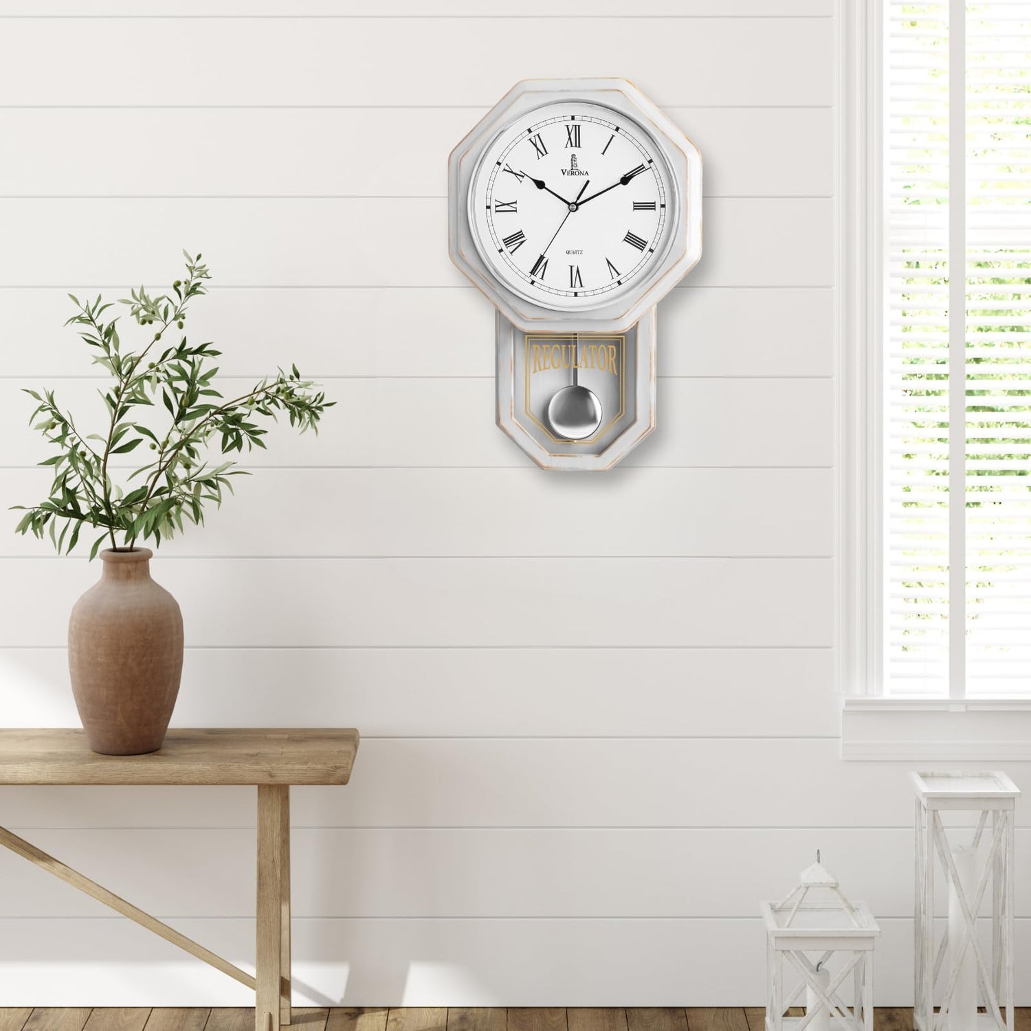 White Pendulum Wall Clock - Rustic Wooden Farmhouse Wall Clock - Regulator Clock Battery Operated - Wood Pendulum Clock - Decorative Wall Clocks for Living Room Decor, Home, Office and Gift 18x11