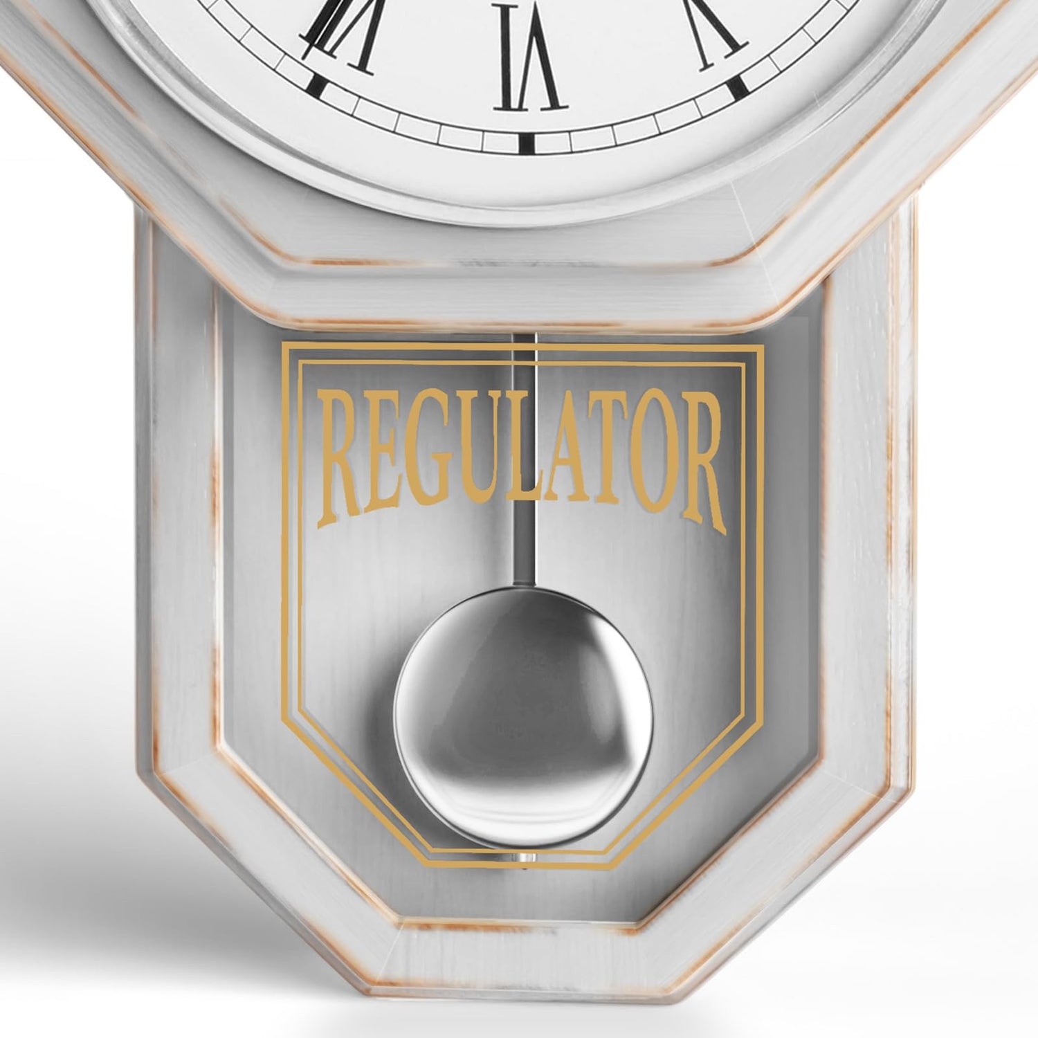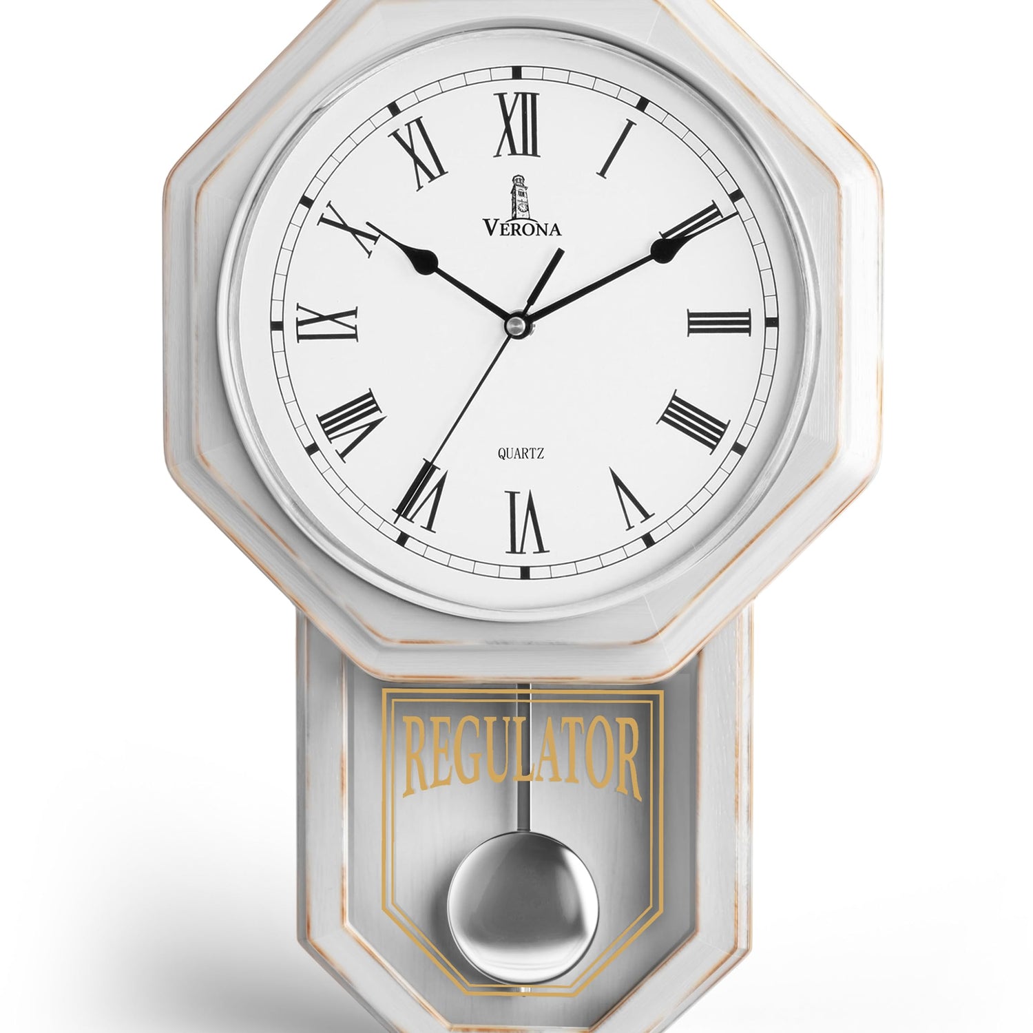 - GET READY TO fall in love with our premium Rustic Wooden Pendulum Clock! Our creamy white farmhouse style schoolhouse clock with regulator design showcases a white analogue dial with easy-to-see black Roman numerals that can be seen from across the room. Providing comfort and convenience while adding character and style to any room in your classy home!
