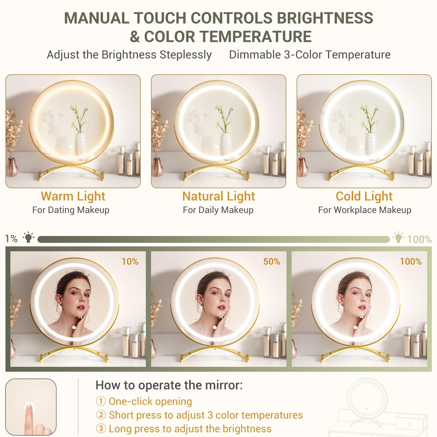 - Vanity Desk with Mirror & 3 Colors Lights: Our vanity makeup desk provide a round movable mirror with 3 different color settings: warm yellow, natural white and cold white light, soft and not dazzling light source, allowing you to make-up for a long time without hurting your eyes. You can click the button easy to change the color or adjust the brightness steplessly according to different scenes and different makeup. Bring yourself a joyful dressing experience with this makeup vanity.