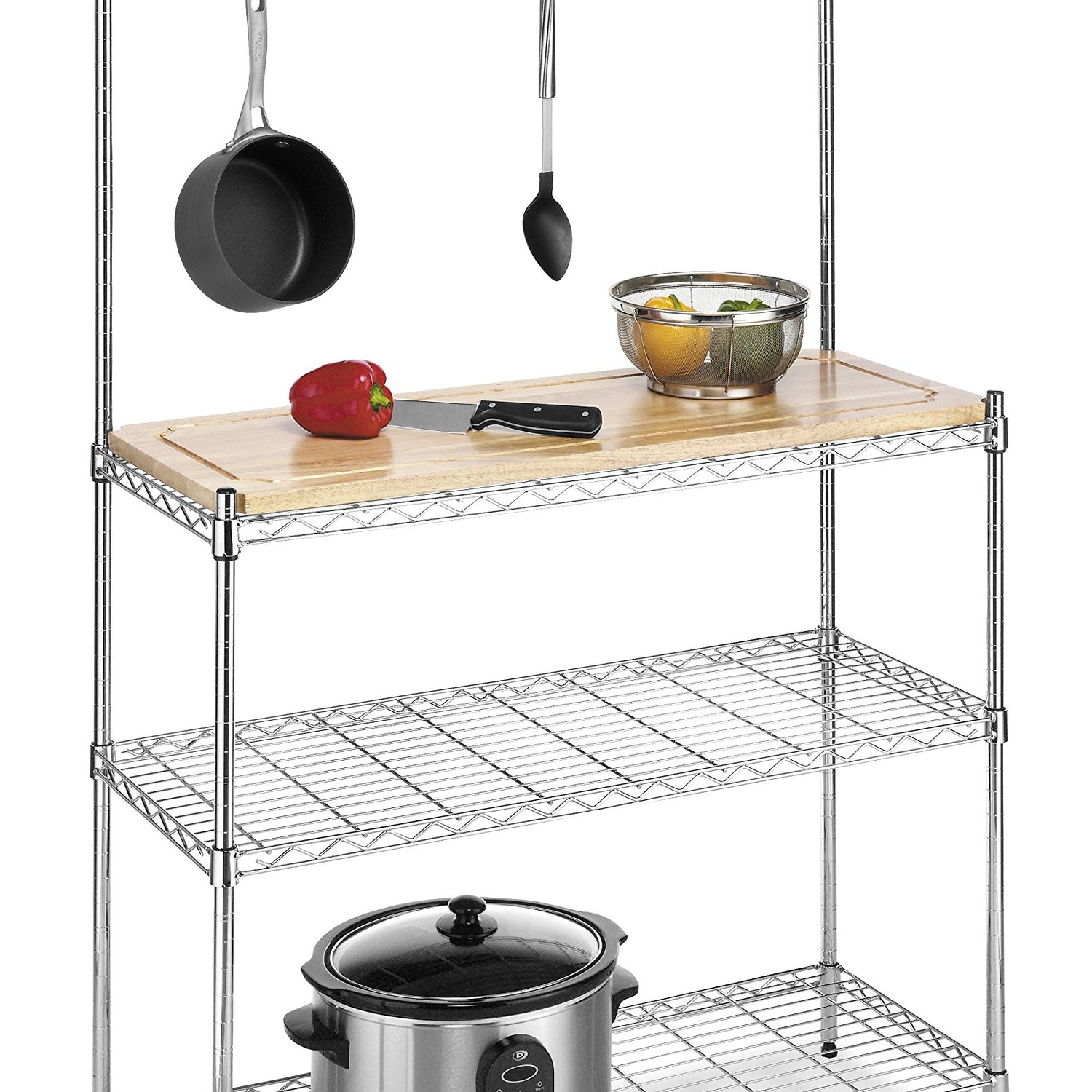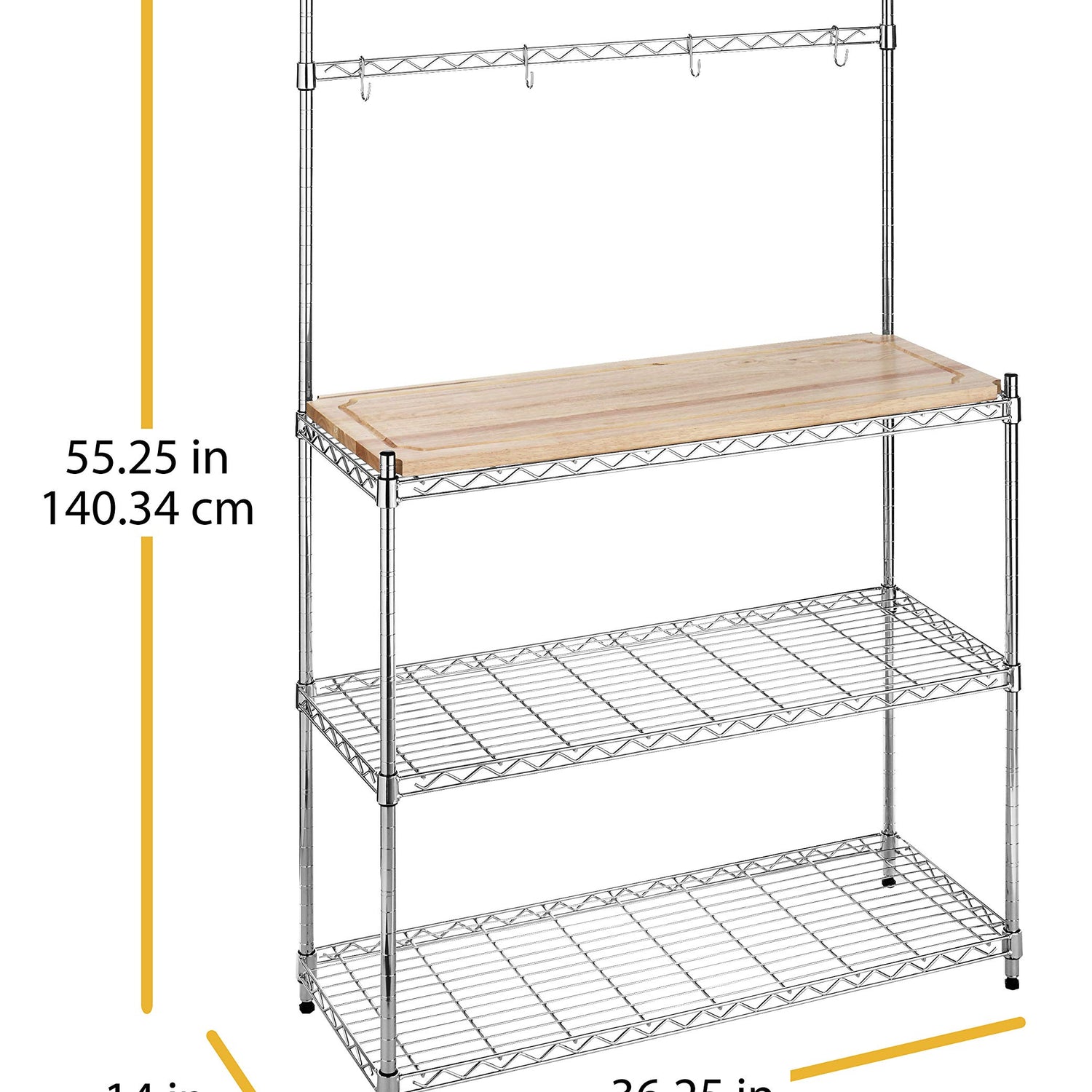 Kitchen wire baker's rack with cutting board top. There are two shelves below cutting surface and one shelf above. Baker's rack comes with hooks for hanging utensils. Unit measures 14-Inch by 36.25-Inch by 55.25-Inch.