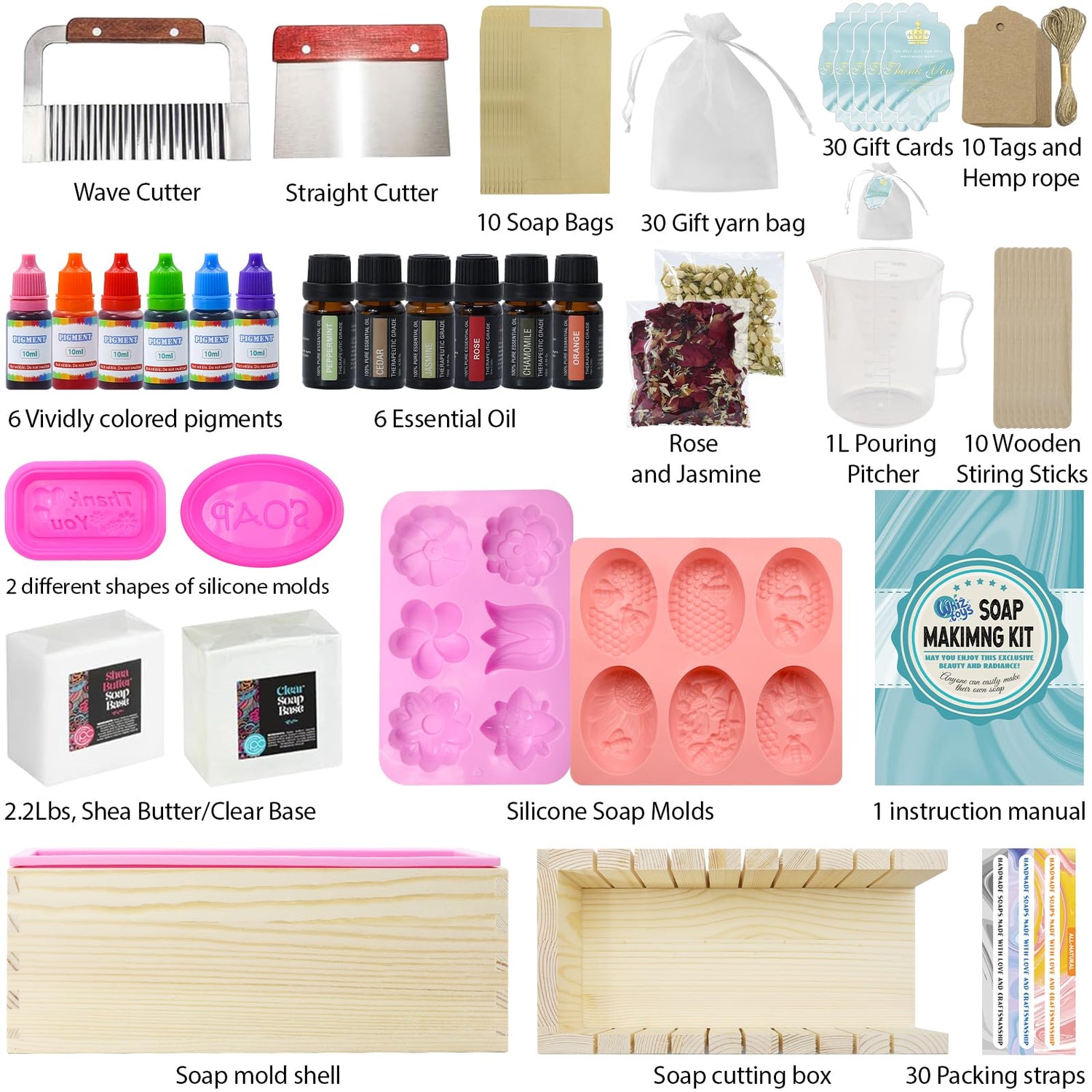 - Luxurious and Rich Soap Making Kit: Comes complete with everything you need - 1 soap cutting box (11*5.5*3.15 inches), 1 round silicone mold (8.5*7.7*1 inches), 2 different shapes of silicone molds, 1 floral silicone mold (10.2*6.7*1.18 inches), 1 wavy and straight cutter, 1 liter pouring kettle, 1 soap mold shell and 1 corresponding silicone mold (11*3.5*3.2 inches), dried rose and jasmine petals, 6 essential oils, 6 colorful paints, 2.2 lbs. of shea butter/clear base, 10 wooden stirring rods, 30 gift cards, 30 wrapping label tapes (3 styles), 30 gift yarn bags (can be used for gift wrapping and bubble netting), 10 kraft paper soap bags, 10 tags and twine, 1 book Instruction Booklet