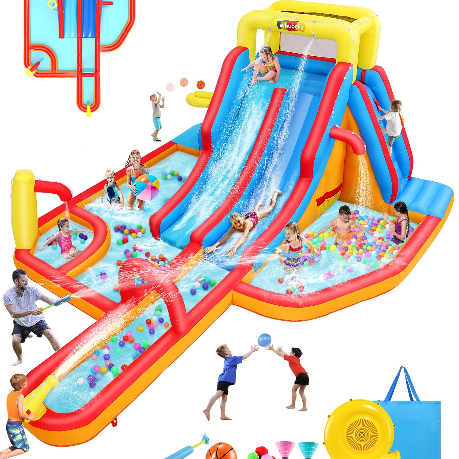 - 【Whubefy Inflatable Water Slide for Kids】Perfect for group fun! This water slide bounce house can hold 2-3 on the dual long slide, 1 at the water cannon, 2 on climbing walls, 1 in independent deep pool, 2 in a shallow pool with shower heads for cooling off, and 2-4 in a large shallow splash pool for basketball and water fights. No waiting – every zone stays busy with non-stop sliding, climbing, dunking, and laughing. Perfect for sharing, friendship, birthday parties, family gatherings. Max. Weight on Inflated Area: 400 lbs, individual weight limit: 90lbs