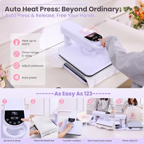 - 【Versatile Applications & Easy-operating Heat Press】Whubefy automatic heat press isn't just a t shirt press machine – it's your gateway to endless creative possibilities. Beyond apparel, this versatile machine effortlessly handles wood signs, ceramic tiles, mousepads, and more, up to 1.85" thick. Whether you're a hobbyist exploring new ideas or a professional expanding your product line, this heat press adapts to your needs, allowing you to diversify your offerings and unleash your creativity like never before