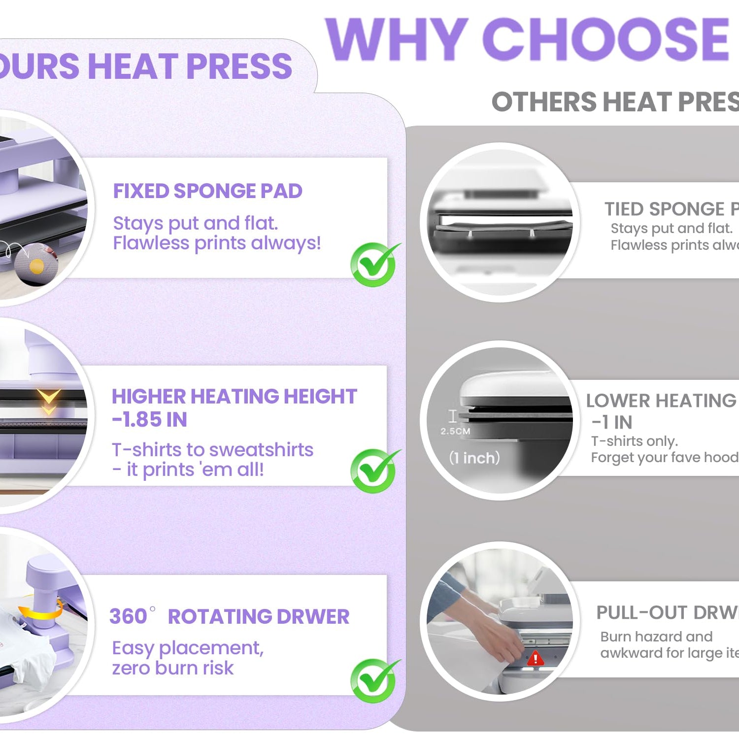 - 【1.85" Elevated Clearance for Diverse Projects】Whubefy's 15x15 heat press boasts a substantial 1.85" clearance, significantly expanding your project range. This increased height accommodates not just standard t-shirts, but also bulky items like hoodies, wooden signs, and thick canvas bags. From thin fabrics to hefty materials up to 1.85" thick - this versatile machine handles it all. No more thickness limitations! Whether you're a hobbyist or professional, Whubefy's heat press unlocks endless possibilities for your heat transfer projects