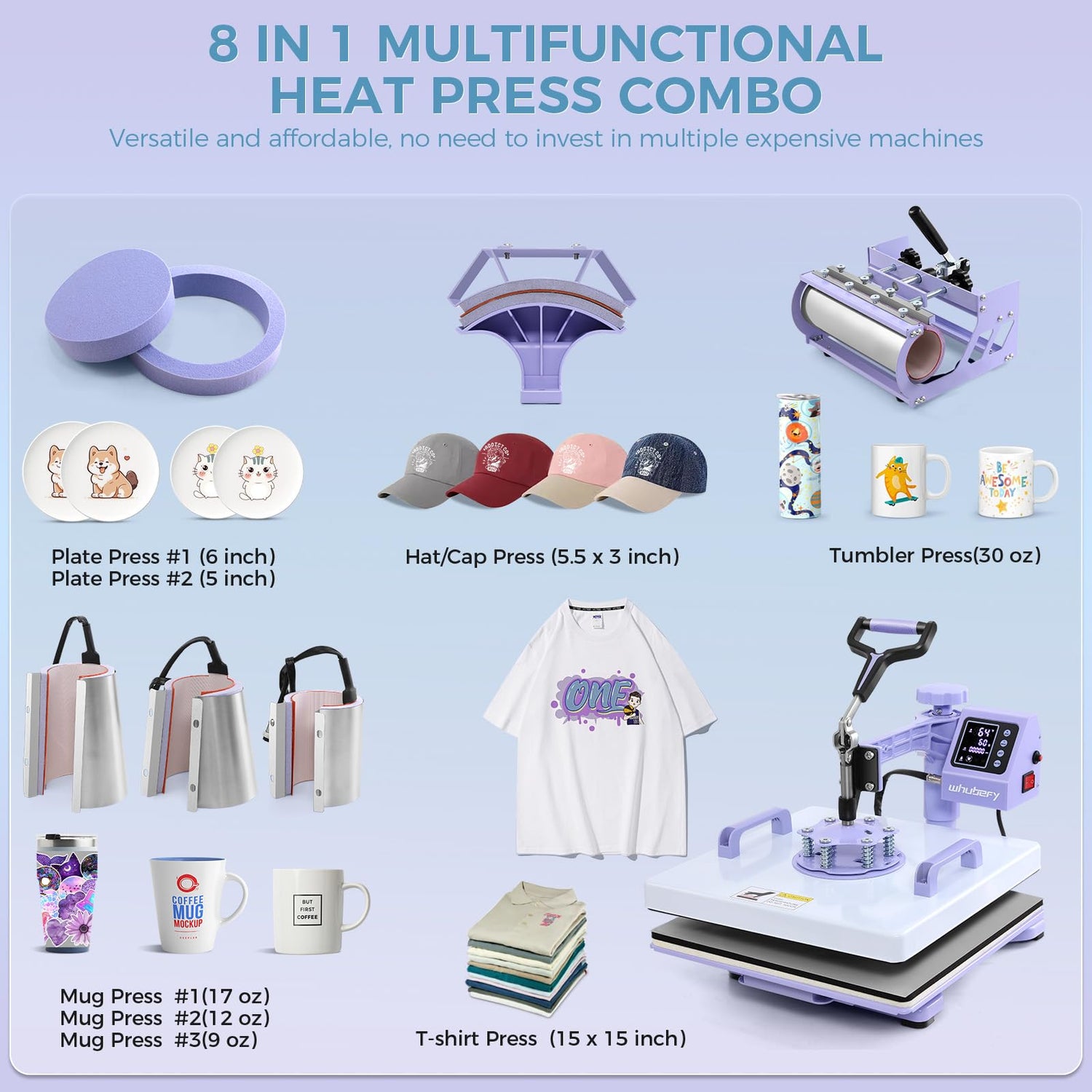 Whubefy Heat Press 15x15, Heat Press Machine for Shirts, Pro 8 in 1 Heat Press w/11-30 oz Tumbler Press, Heat Press Machine Combo Fast & Even Heating, 360°Swing Away Sublimation for Hat Cap Mug Plate