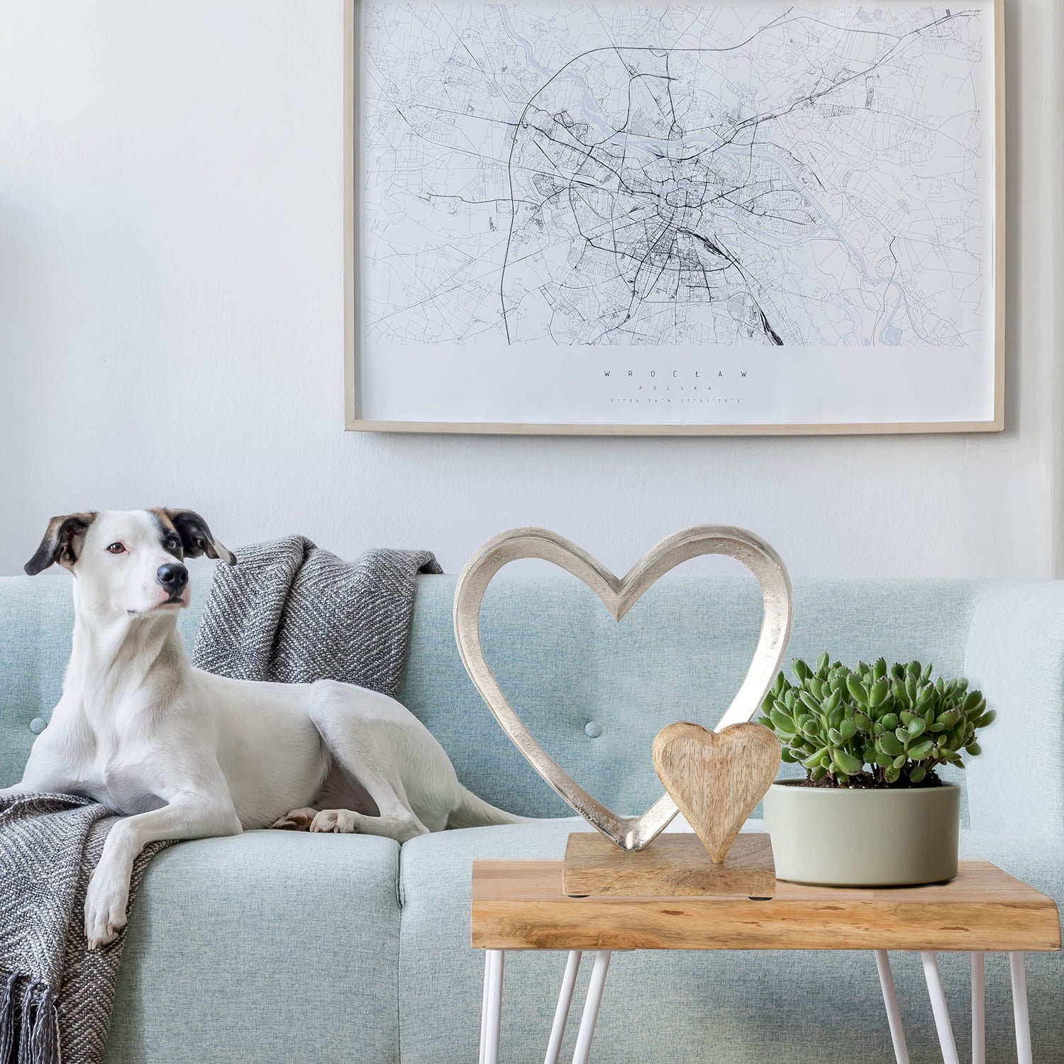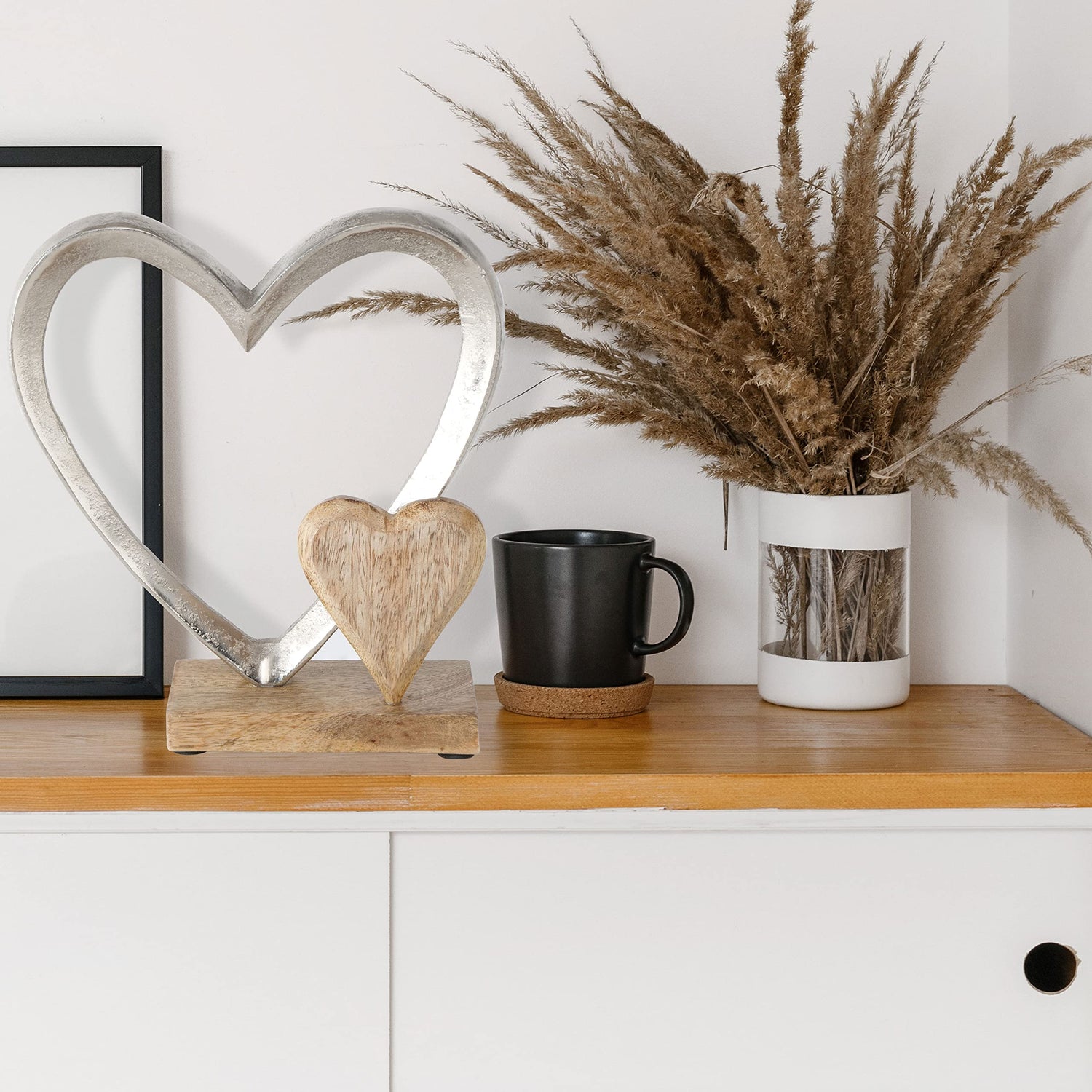 - Visually communicate where love lives in your home with this double eternity heart figurine. With a smaller wooden heart snuggled beside the larger silver metal one, this eye-catching composition is perfect to perch upon a mantel or accent a bookshelf.
