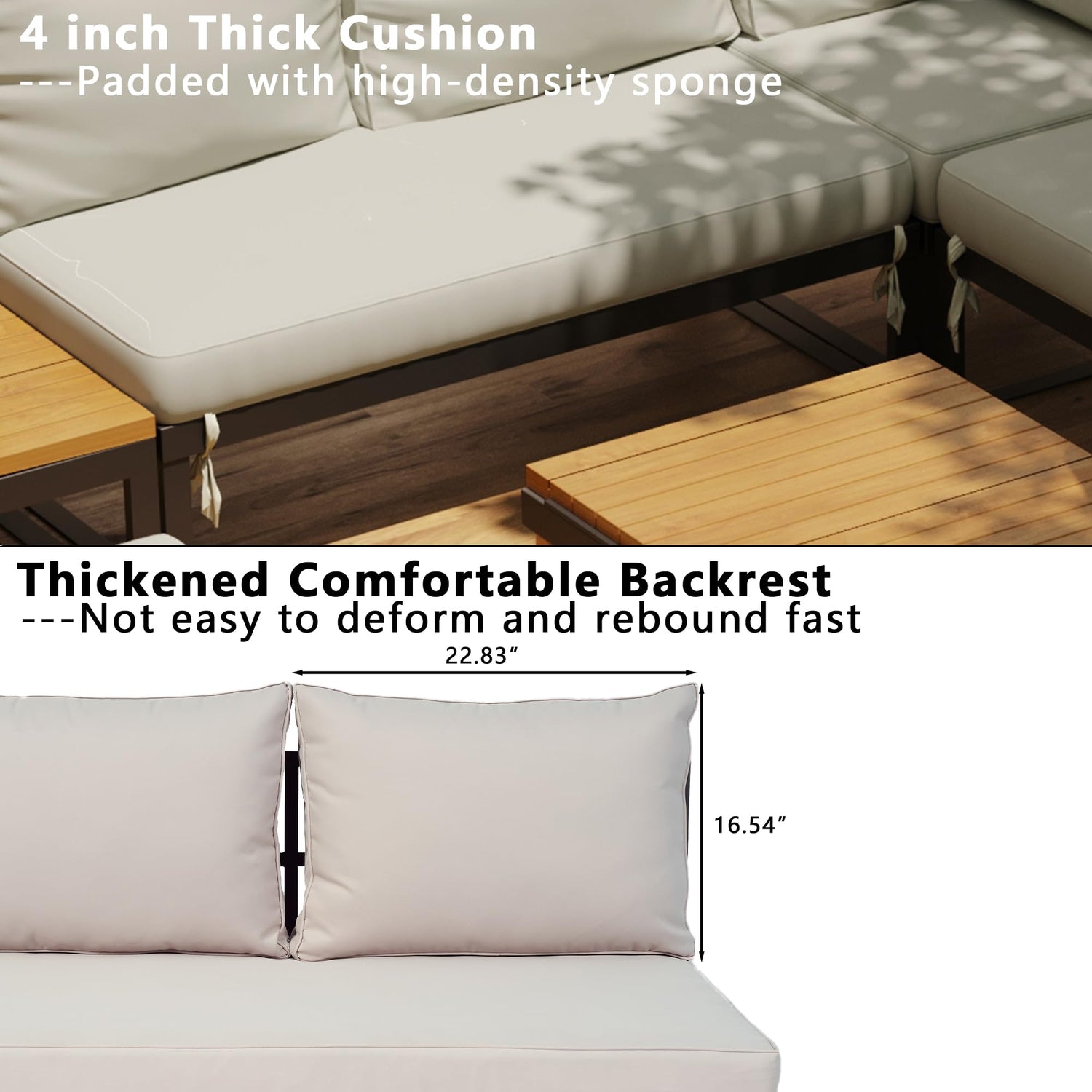 - Premium Comfort---The patio couch features high-density sponge seat cushions that are 4” thick and 6 pillows measuring 22.8”(L) x 16.5”(W )x 5.9”(thickness) , offer excellent rebound and ergonomic support—perfect for extended lounging. Cushions are upholstered in water-repellent, UV-resistant fabric to resist fading and moisture with removable, machine-washable covers for easy maintenance.