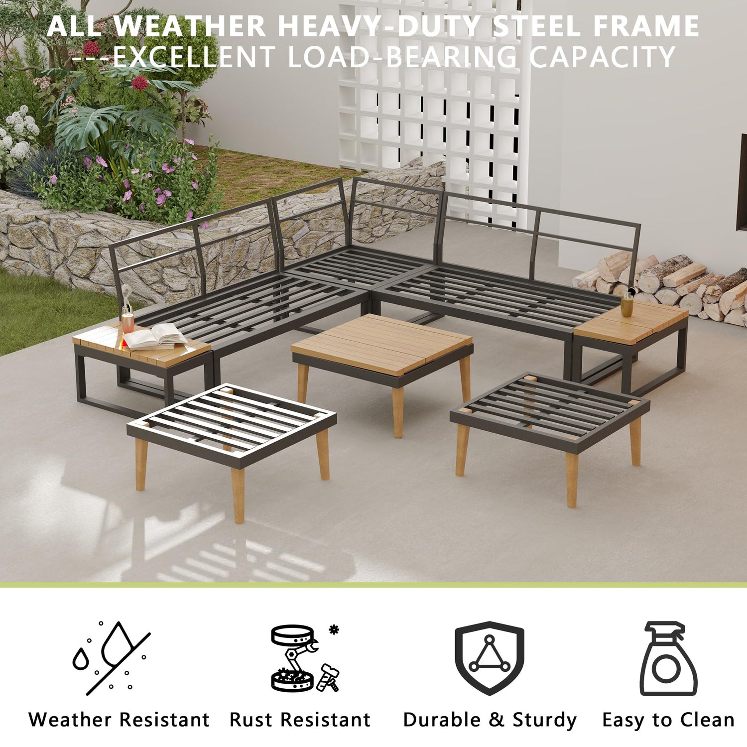- Durable Construction---Constructed with a heavy-duty powder-coated metal frame, this outdoor sectional sofa set is built to resist rust, corrosion, and all weather conditions. Reinforced thick wood legs ensure exceptional weight capacity and long-term durability.
