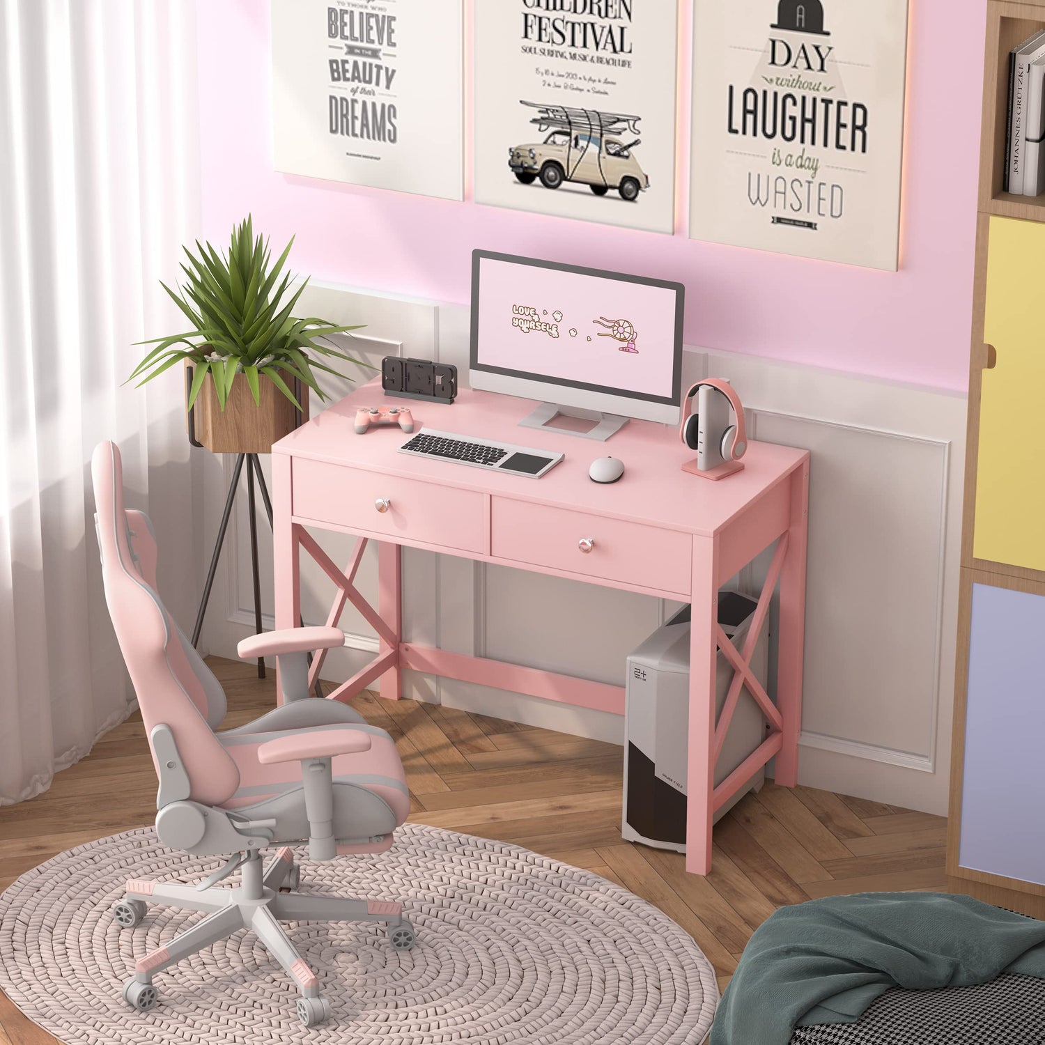 WiberWi Home Office Desk with Drawers, Modern Writing Computer Desk for Bedroom, Small Pink Makeup Vanity Table Desk for Girls, Study Table for Home Office