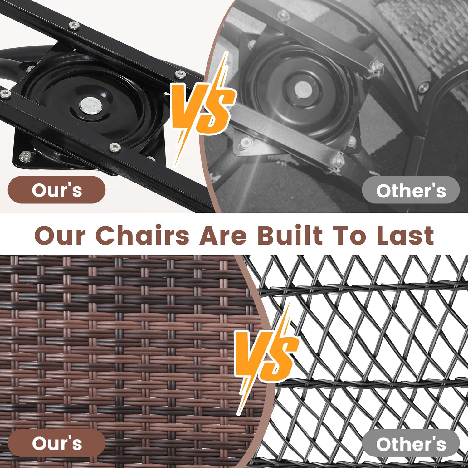 - 【360 SWIVEL WITH GLIDER FUNCTION】 Our wicker gliders can swivel 360 degrees and are very stable when rotating due to the oversized base. The oversized base prevents tipping as well as other safety issues when turning the chairs and allows for a very fluid turning experience. The oversized base also insures that you can rock safely without the risk of the chair tipping.