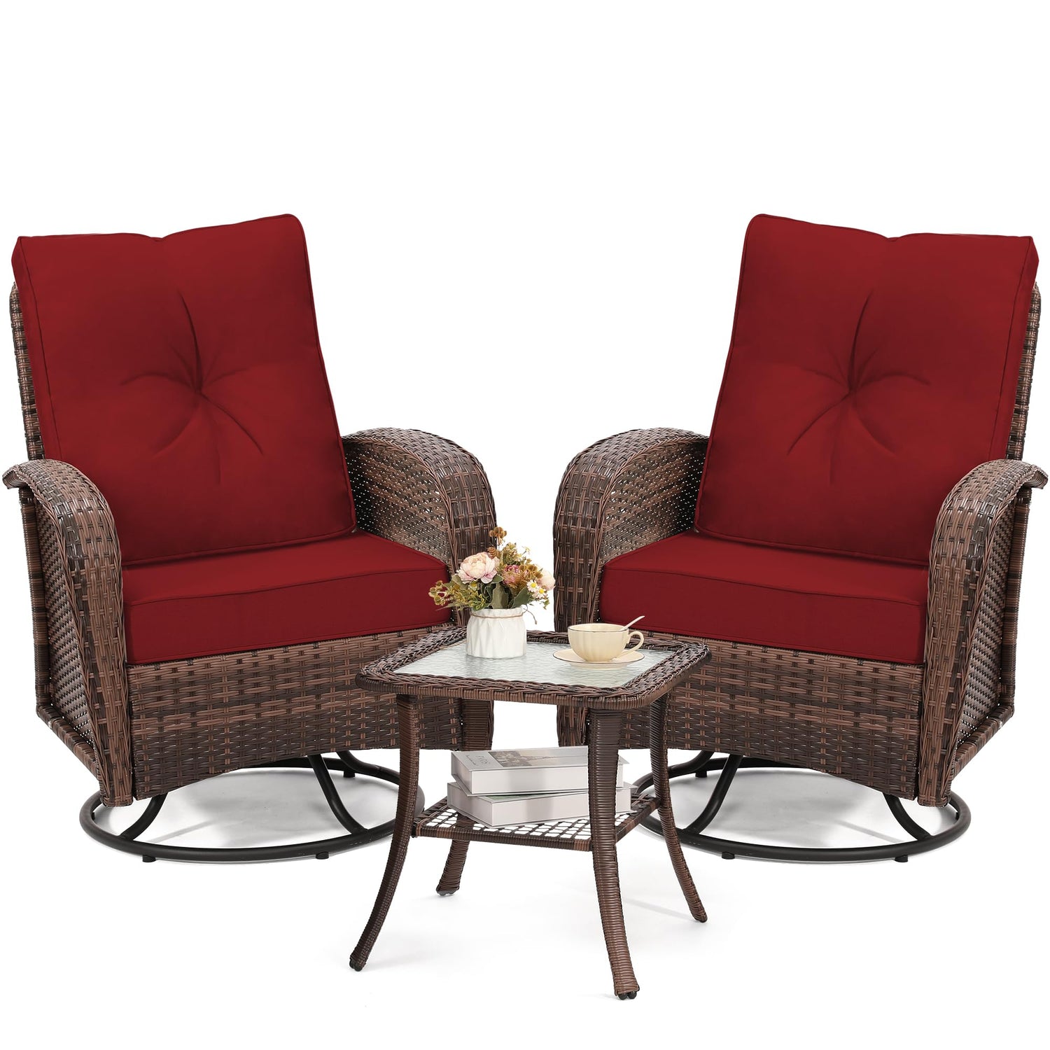 wildformers 2 Luxury Outdoor Swivel Wicker Glider Patio Chairs with Table Set, Overstuffed Washable Cushions, Ideal for Porch, Balcony, Deck, Brown Rattan and Red Cushions