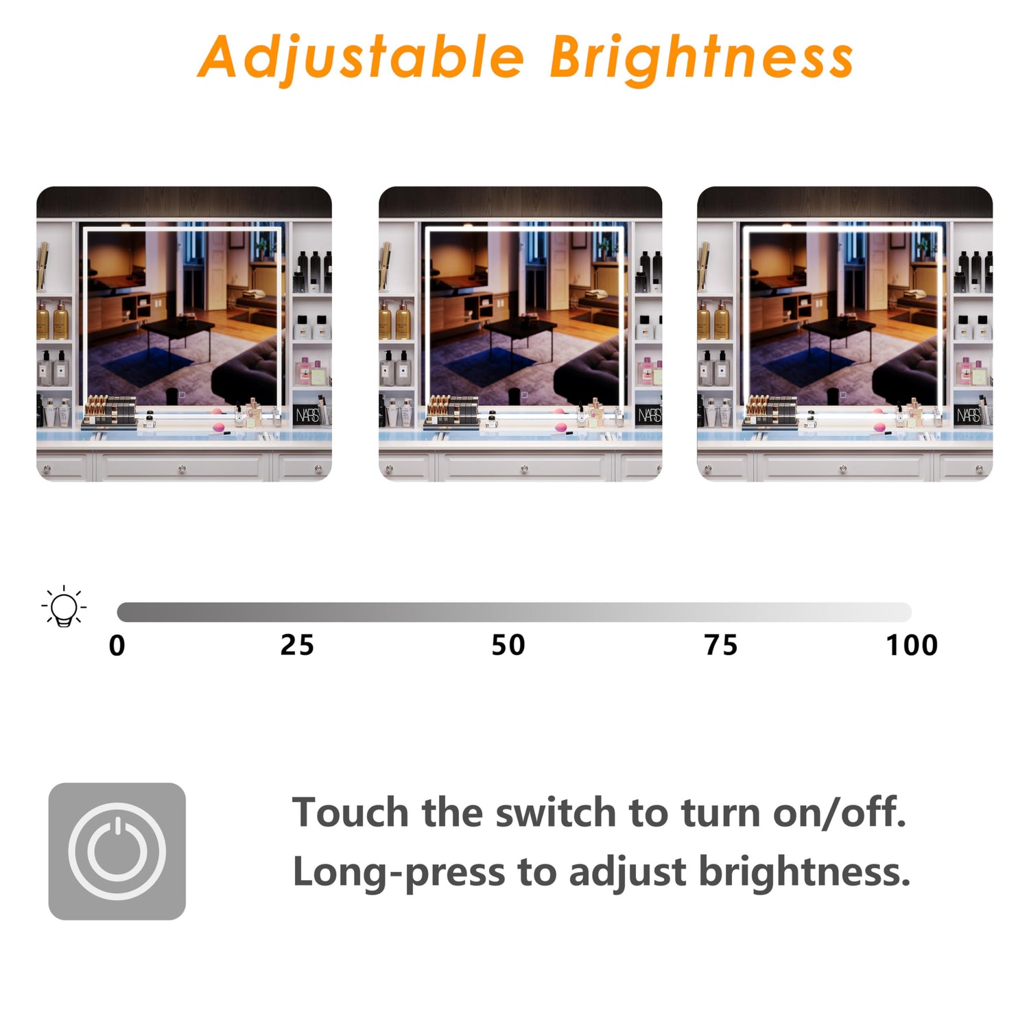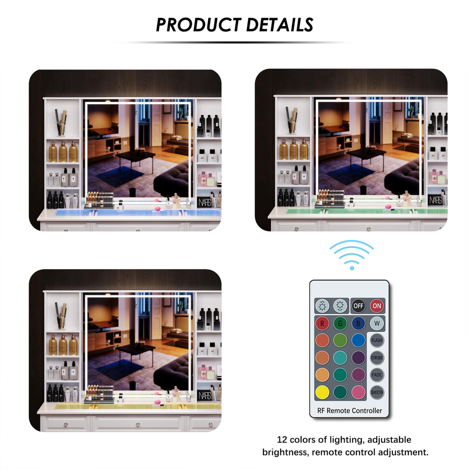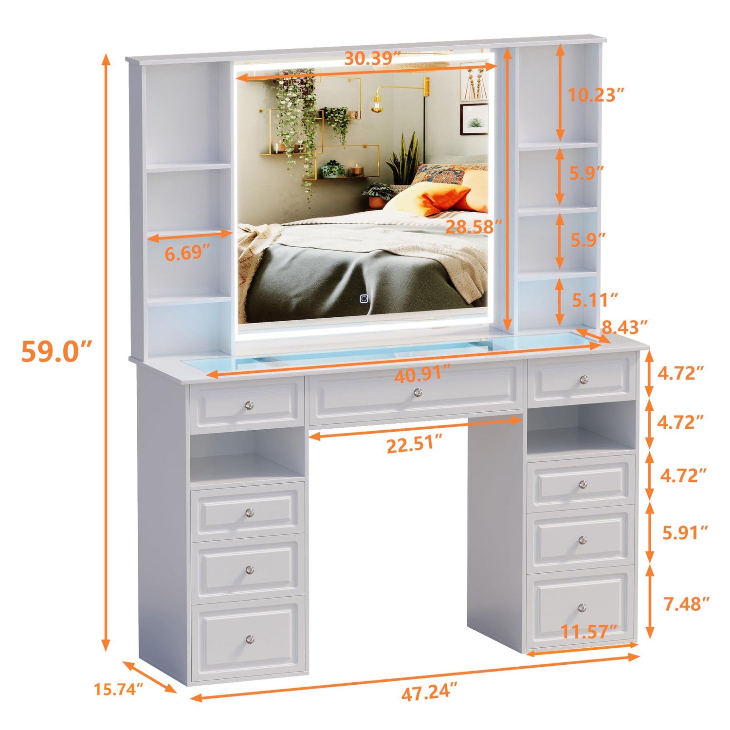 Wildhome Vanity Desk with Mirror and Lights, Glass Top Dressing Table with 9 Drawers, Makeup Vanity with Storage Bench, European Style Vanity, Adjustable Brightness Vanity for Bedroom(White)