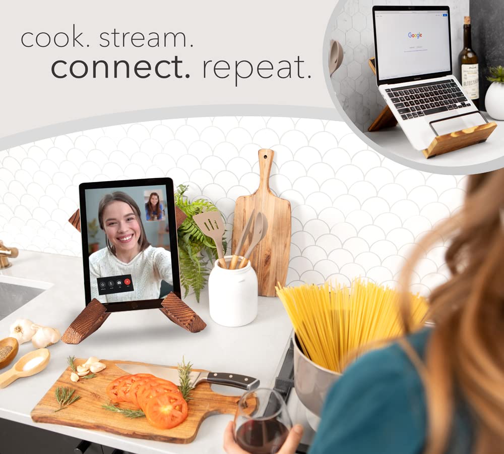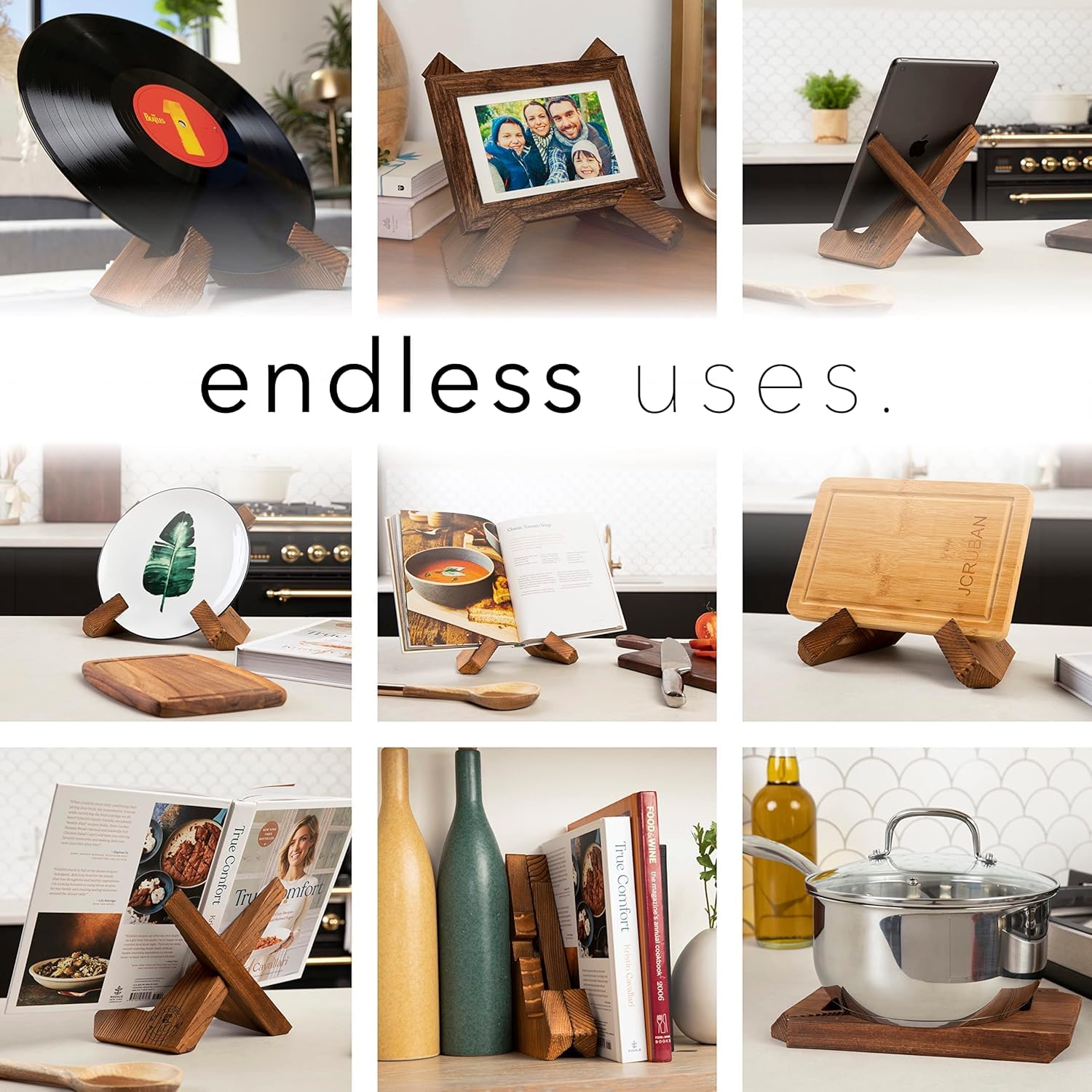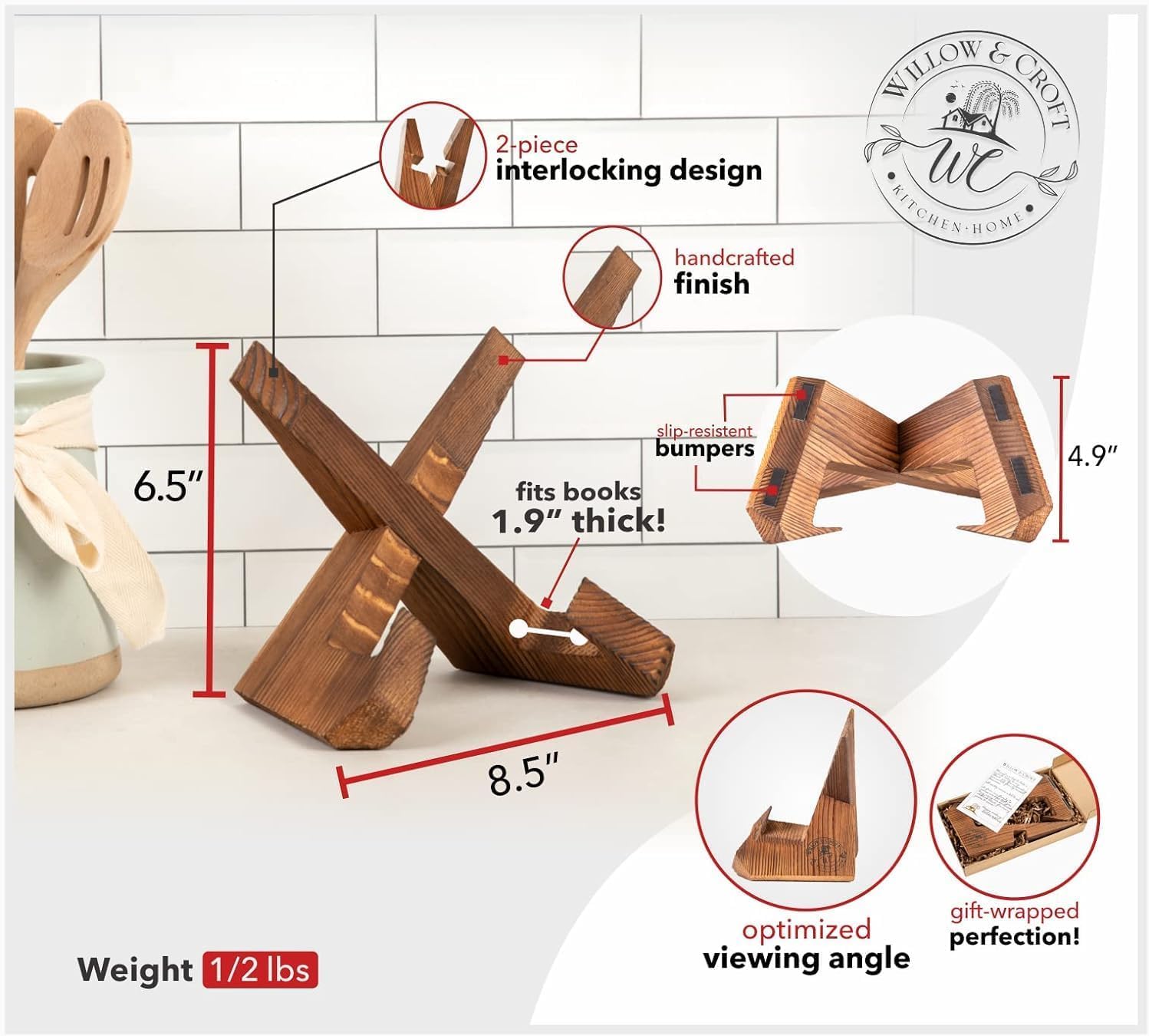 Details: From Craft Fairs To High-End Housewares, meet The Handcrafted Willow & Croft Cook Book Holder and Photo Frame Display Stand! DIMENSIONS: 6.5” tall and 8.5” wide wooden stand with and 8.5” x 4.9” countertop footprint. FEATURES: (1) Fits big cookbooks up to 14 inches tall and 1.9 inches thick. (2) Perfectly-fixed viewing angle to reduce stress on the neck and back, and it can be neatly disassembled for storage. (3) Four silicone bumpers for high surface grip without scuffing or scratching countertops. (4) Space-saving design to reduce countertop clutter. (5) Once disassembled, doubles as a convenient pot rest or heat-resistant baking dish trivet. (6) Gift-ready, with shredded paper stuffing, for a charming unboxing experience. HANDMADE CRAFTSMANSHIP: Made from the finest European Scots Pine (1.0 in. thick), fire torched for a rustic farmhouse look. CARE: Can be wiped clean, do not submerge. USES: Durable recipe holder, tablet or iPhone holder, chopping board holder, rustic kitchen decor, and household notes display. Order yours NOW from Willow & Croft!