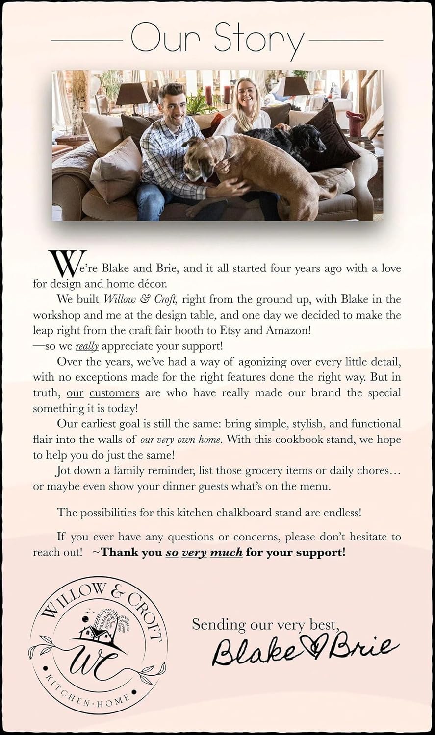 - From Craft Fairs To High-End Housewares: Hi, we’re Blake and Brie! And we’re excited for you to try our premium handmade, gift-ready book holders! Perfect as a space-saving book stand, plate display holder, or photo display stand. With its rustic, distressed finish and simple farmhouse design, it’s an easy choice for housewarming gifts and other presents! Order yours NOW from Willow & Croft!