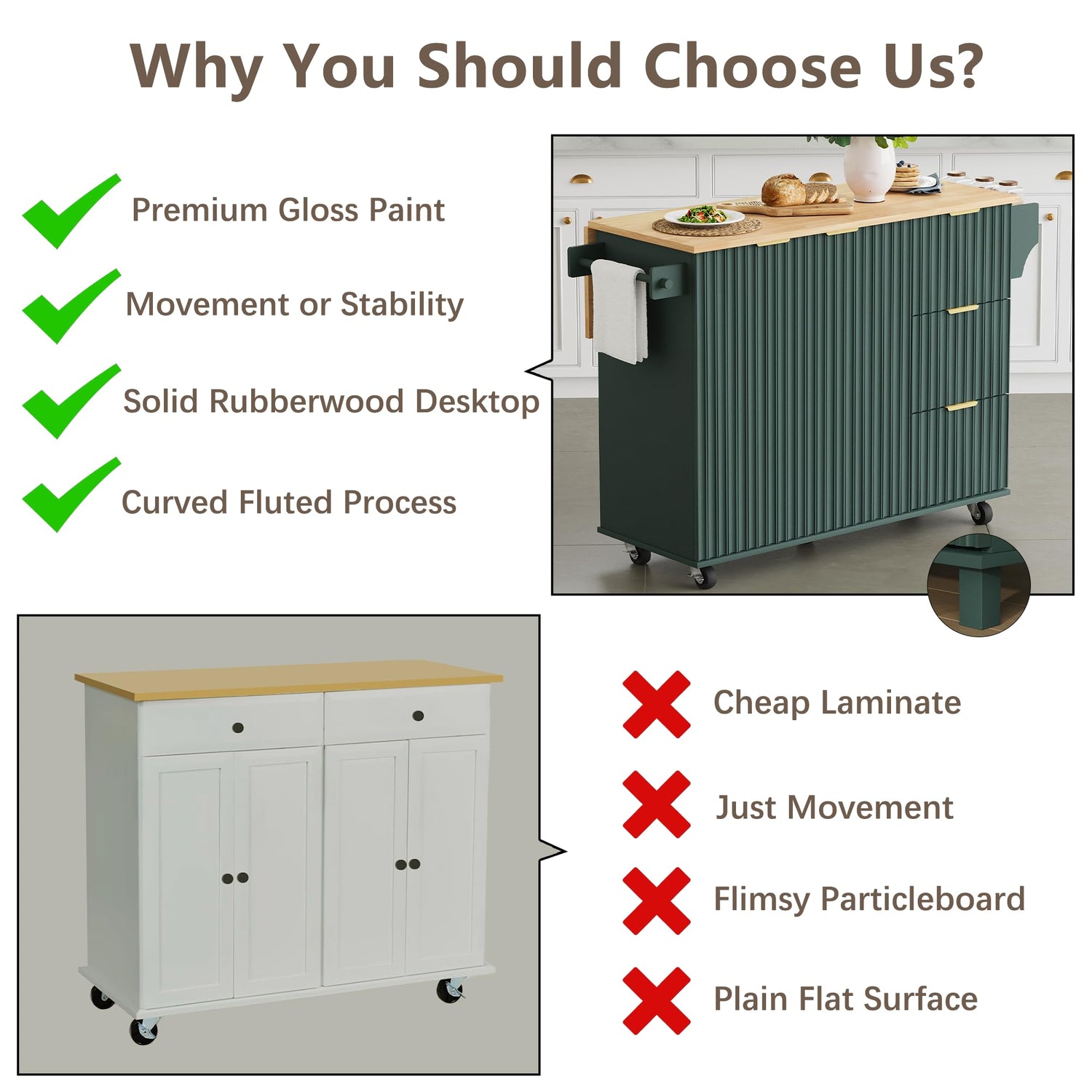 win2win Rolling Kitchen Island with Storage, Portable Kitchen Island with Drop Leaf Breakfast Bar, Modern Farmhouse Kitchen Cart on Wheels with Fluted Design, Towel Rack, Spice Rack, Olive Green