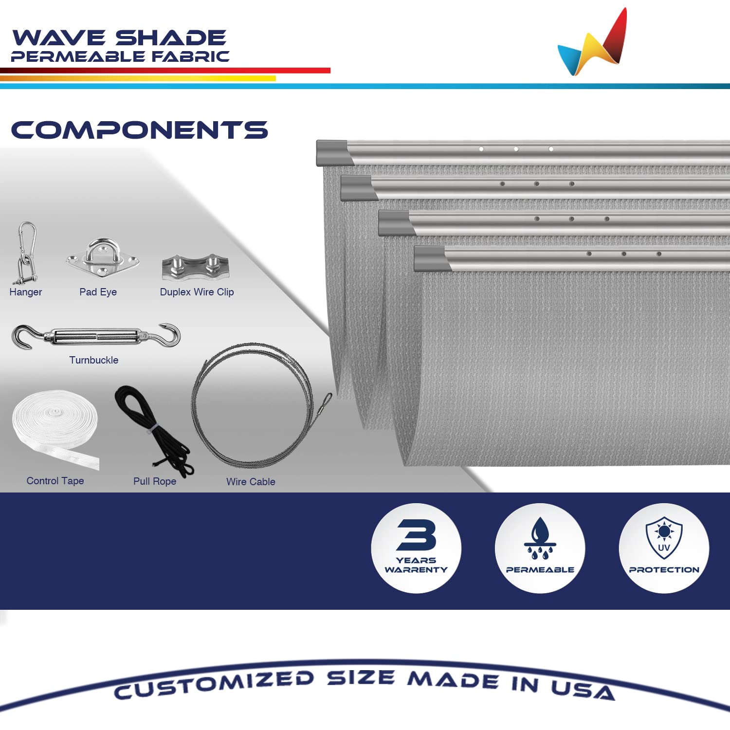 - U-SHAPE COVER - This retractable shade cover can be pull back easily and you can close shade cover when it not in use. Each panel rod has three pre-drilled hole on each end for you to choose from to attach the shackle and snap hook which needs to hang onto the wire cable on each side.