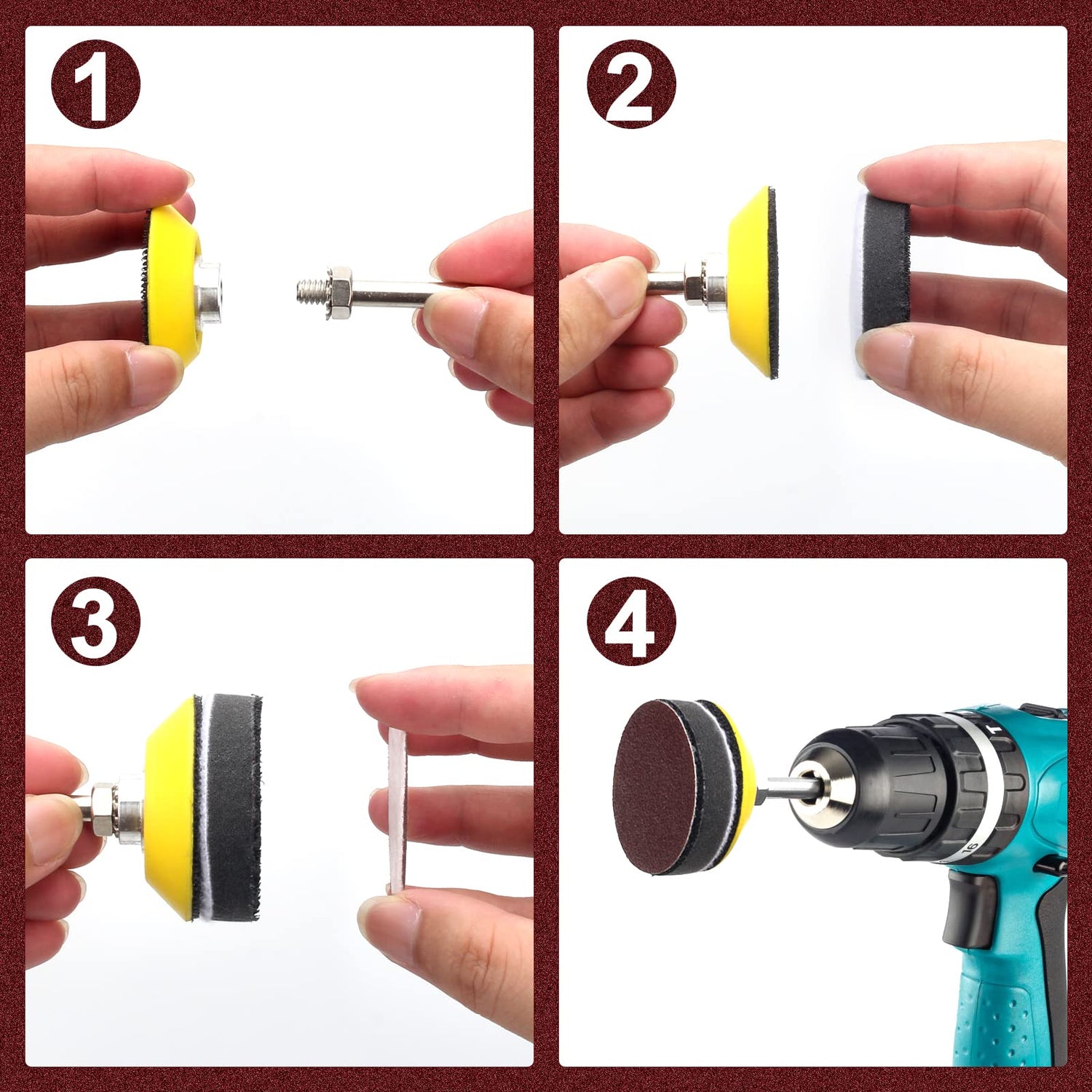 - 【Perfect Combination】: The product set includes 240 pieces of sandpaper with different specifications, 2 hook loop bases, 2 foam buffering pads, and 4 pcs 1/4” metal shafts. The accessories are complete and sufficient in quantity and do not need to purchase other accessories. You deserve to have them!