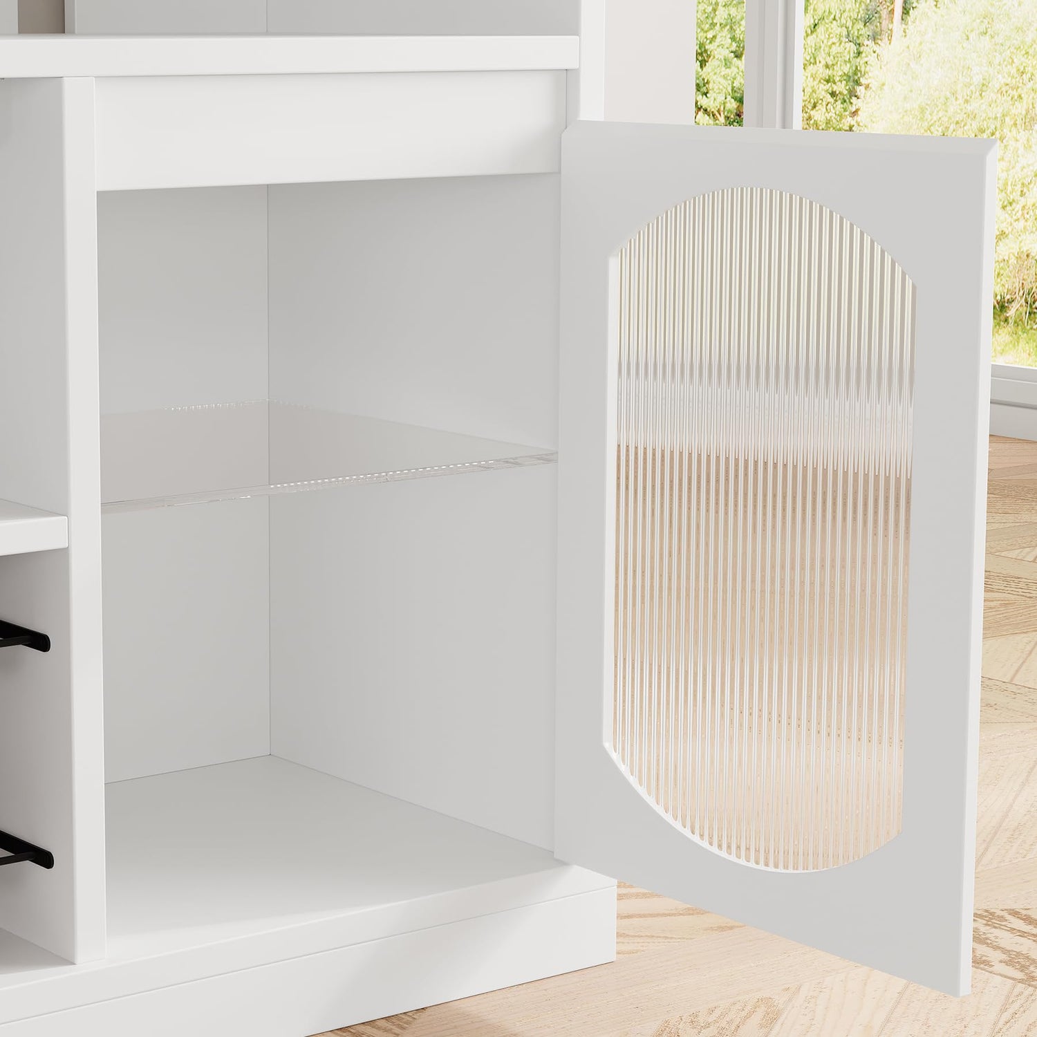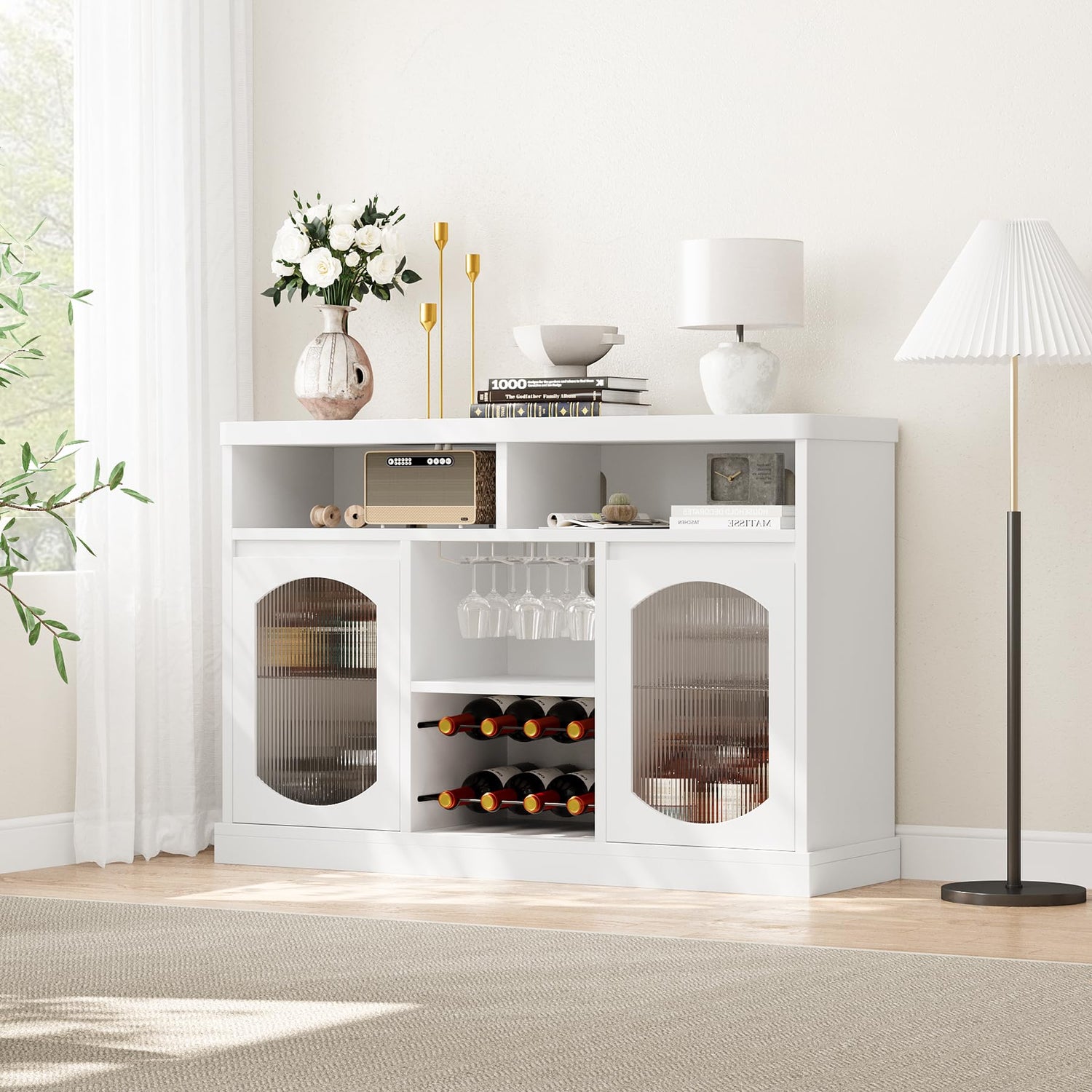 - LARGE STORAGE SPACE - The white coffee bar cabinet measures 47.25” L x 15.55” W x 34.45” H, offering ample storage space and options to keep your space organized. The 47-inch top space easily accommodates frequently used items and provides a spacious workspace. With four open storage spaces and two cabinet storage spaces, you can choose to display or conceal items.