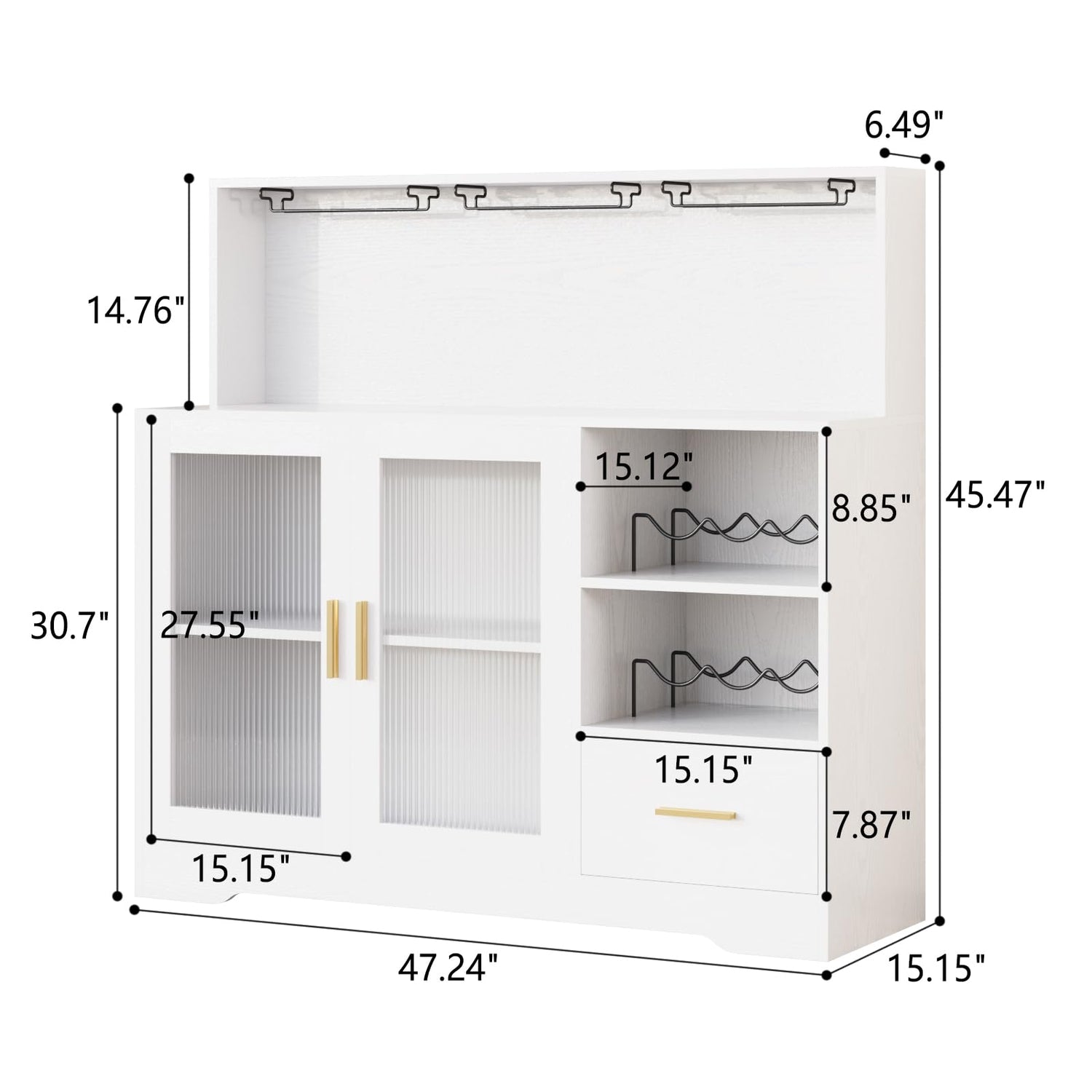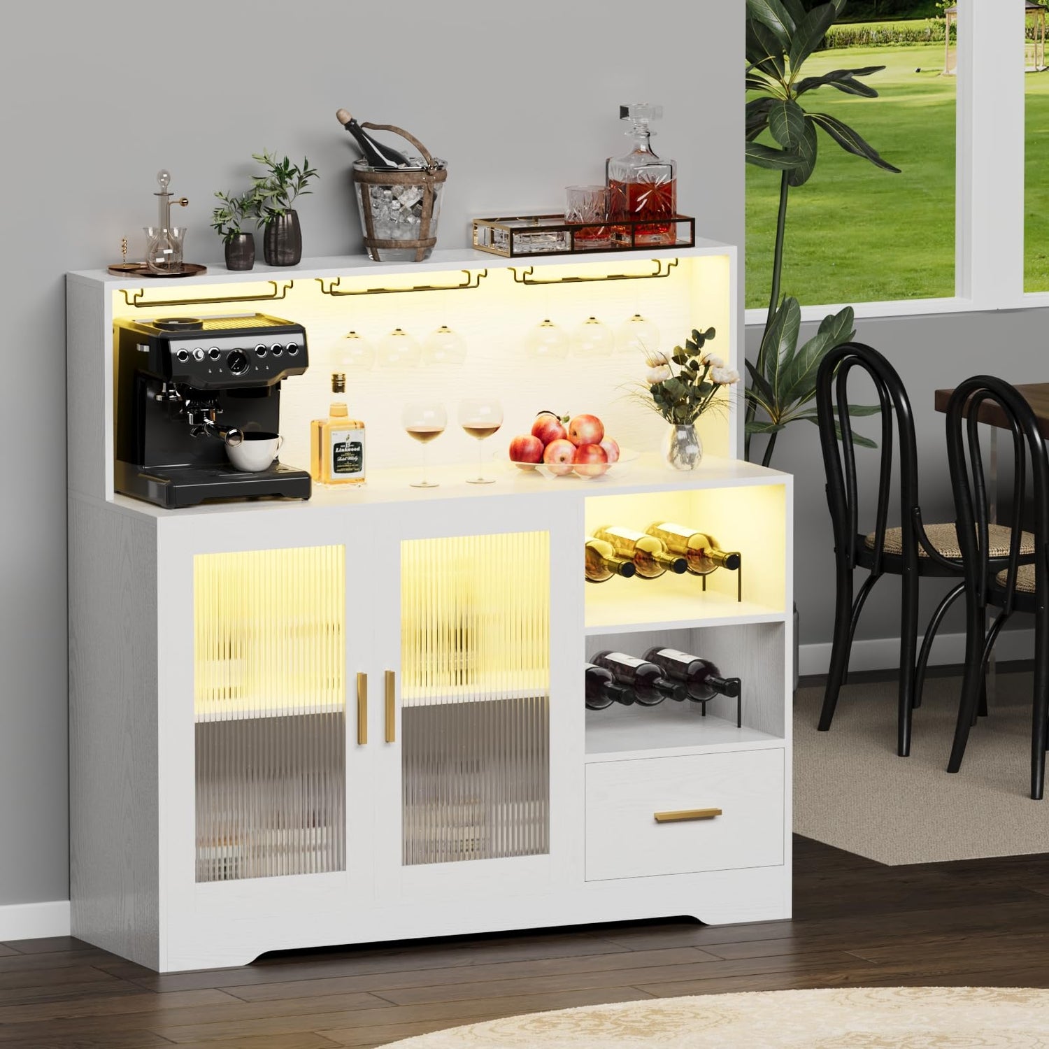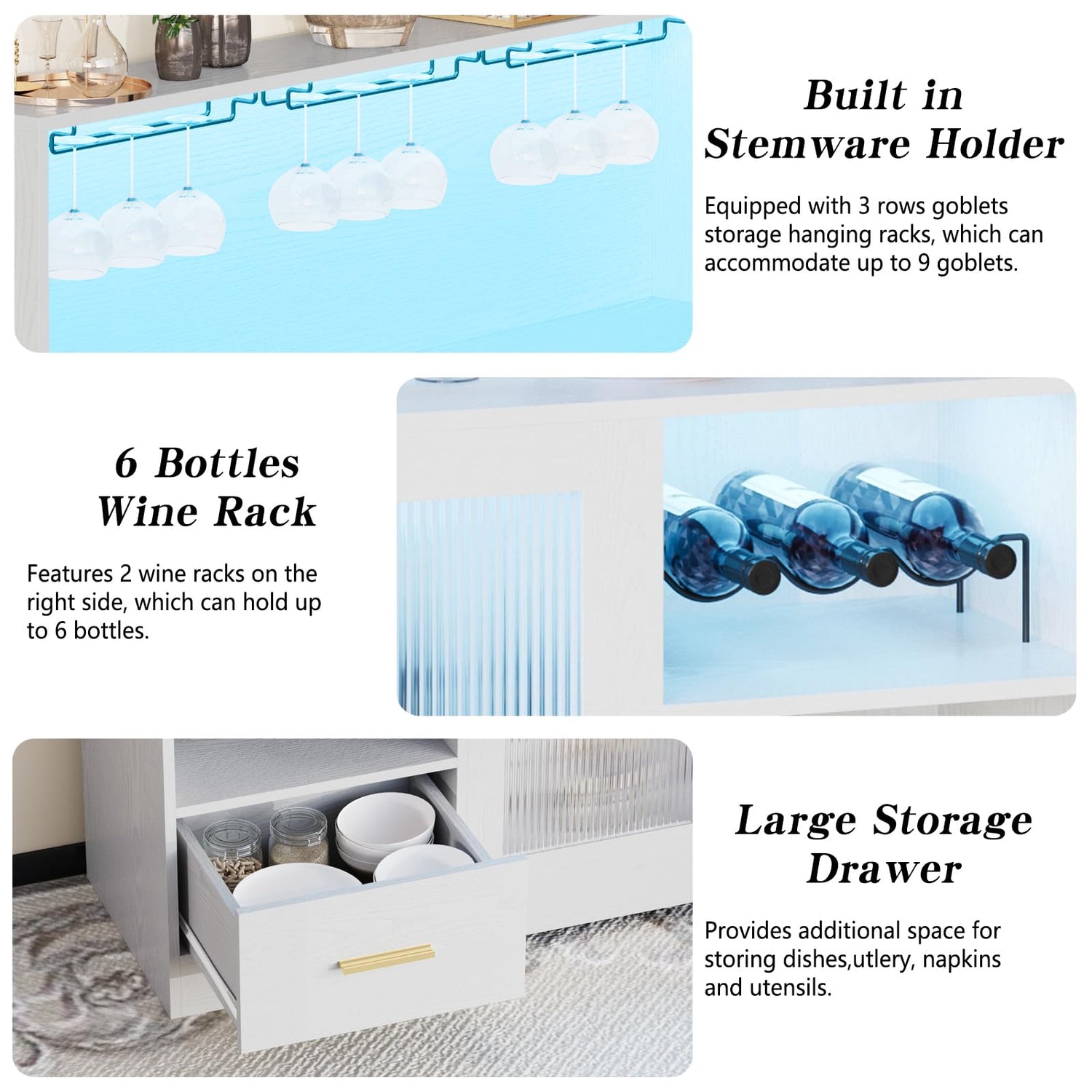 Wine Bar Cabinet with LED Light,with Wine and Glass Rack, Modern Kitchen Coffee Bar Cabinet with Storage, Buffet Sideboard with Drawers(White, Large)