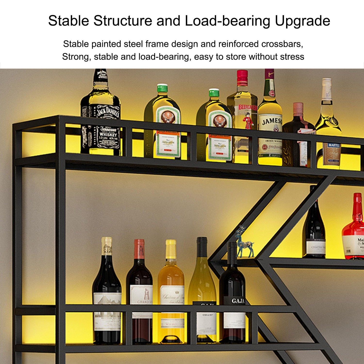 - Ambient Light Design:Bar shelves package includ the light strip which can subt shine on the placed wine bottles, creating a stunning visual effect,and there are gold and black color , warm light or blue light can choose,focusing on the wine rack exhibits,echoing the displayed products